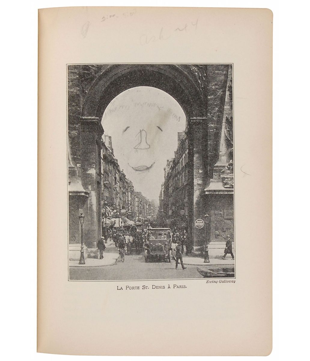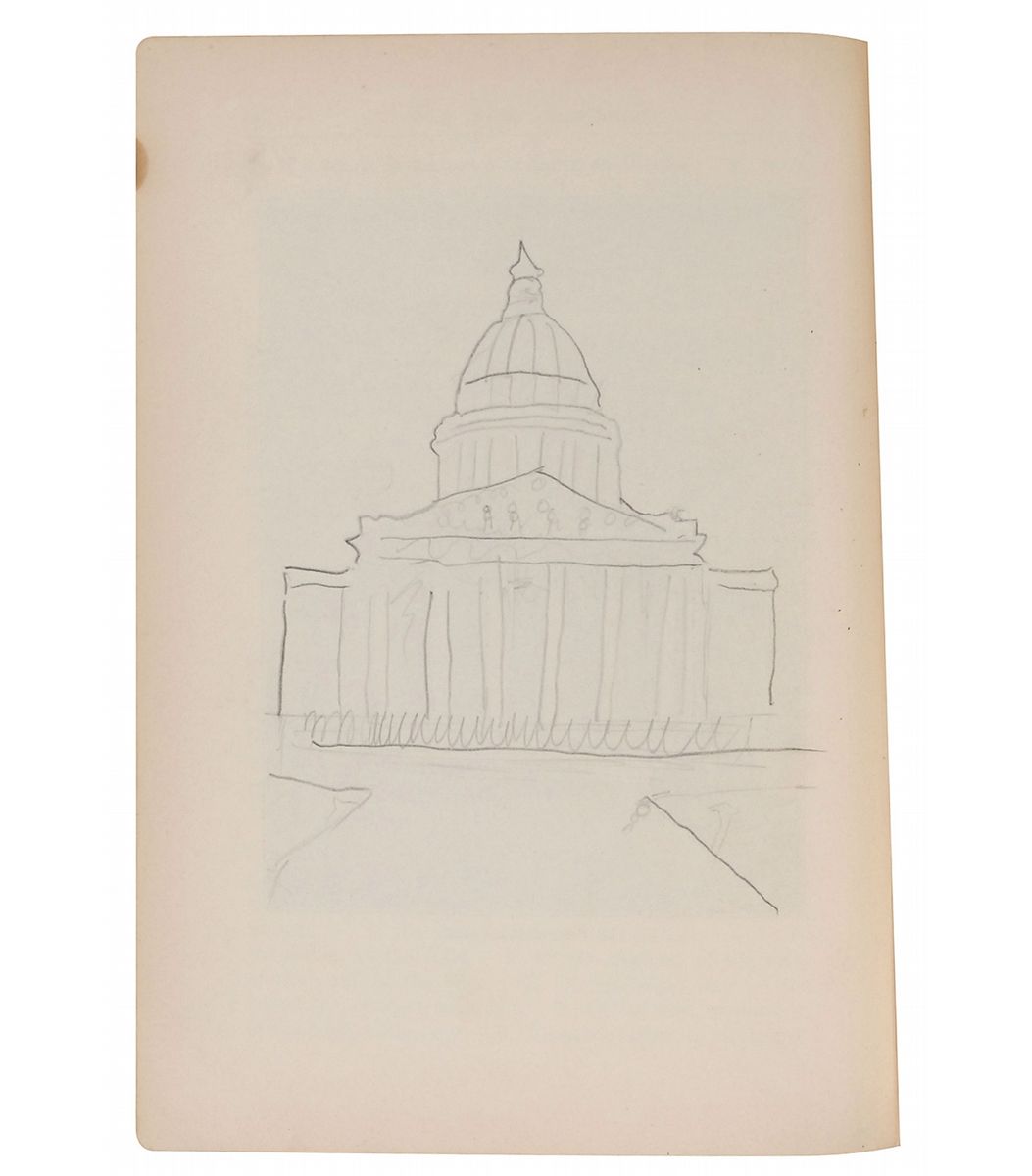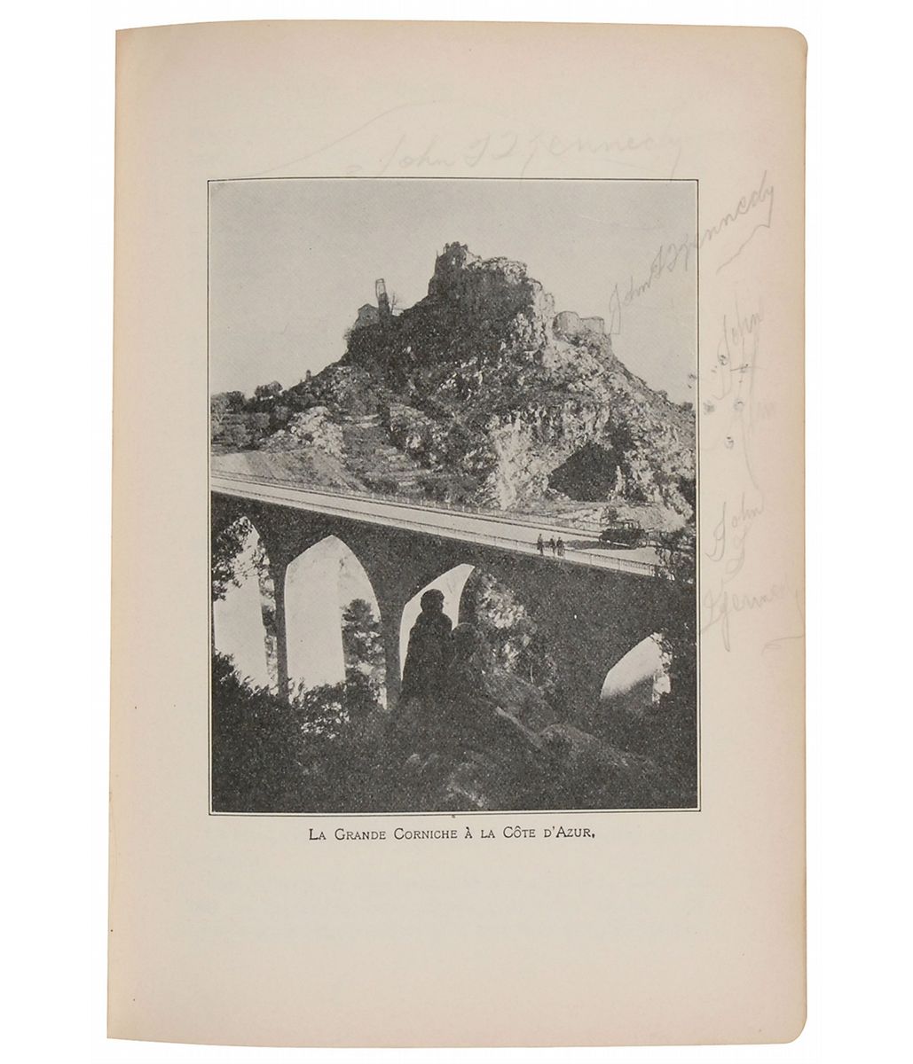 Signed book: The New Chardenal Complete French Course. Boston: Allyn and Bacon, 1929. Hardcover, 5.25 x 7.5, 450 pages, with a handsome custom-made clamshell book box. Signed in blue ink on the first free end page, “Joe Kennedy,” and “Jack Kennedy, Choate House, Room 101, Choate, Wallingford Conn.” The book is also heavily annotated in pencil throughout by Kennedy, who also adds several different variations of his signature, including, “John F. Kennedy“ (24 times), “Kennedy, John F.” (16 times), “J. Kennedy” (3 times), “John Francis Kennedy” (once), “Kennedy” (4 times), “John Francis Fitzgerald Kennedy” (one time). One of the signatures in incorporated into his complete address, “Kennedy, John F., 2921 Pondfield Rd., Bronxville, N. Y.” Kennedy has drawn a face in the arch of a photo of La Porte St. Denis a Paris, and tracing an image of Le Pantheon a Paris on the opposite page. Autographic condition: paperclip impressions over portion of both signatures, uniform toning to signed page, multiple pencil notations to signed page, as well as some adhesive remnants along left edge, small portion of “Wallingford” traced over in Book condition: G-/None. Brown cloth-covered boards; heavy wear to edges, with chips/tears in cloth (mostly at corners and spine-ends); spine sunned; hinges cracked; first and last few pages are detached; heavy marking throughout; soiled and slightly yellowed.