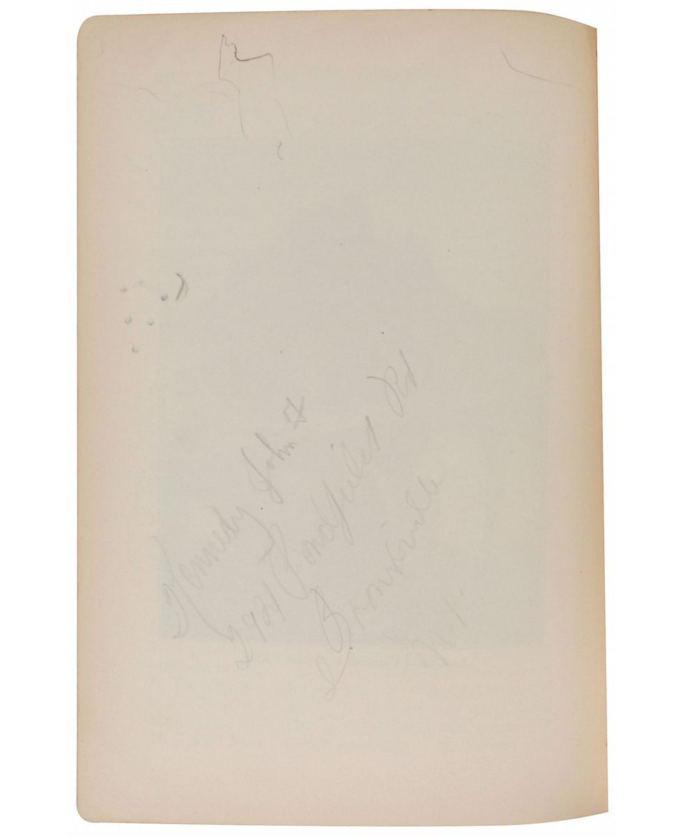 Beginning the ninth grade at Choate in 1931, JFK finally began to make his way out from his athletic and popular big brother Joe’s shadow. Making a name for himself in large part by building his reputation as a talented prankster, he was remembered for such classics as exploding a toilet seat with a firecracker—and turning the headmaster’s scornful designation of ‘mucker’ into a title of pride, forming the ‘Muckers’ Club’ with his friends and partners-in-crime. While his academic record was unimpressive and his health was often precarious, he quickly became one of the most popular students, playing football, basketball, and baseball, serving as the business manager of his senior yearbook, and earning the distinction of ‘most likely to succeed.’ At Choate, he developed the characteristics that helped him become a charismatic politician in later years: a sense of humor and a charming way with words, an interest in politics and history, a strong connection to his peers, and resiliency in the face of his own suffering. Also signed by Joe, Jr., whose signature is extraordinarily difficult to obtain due to his unfortunate early death in World War II, this book captures a crucial time in the young Kennedys’ lives, as JFK began to find his footing.