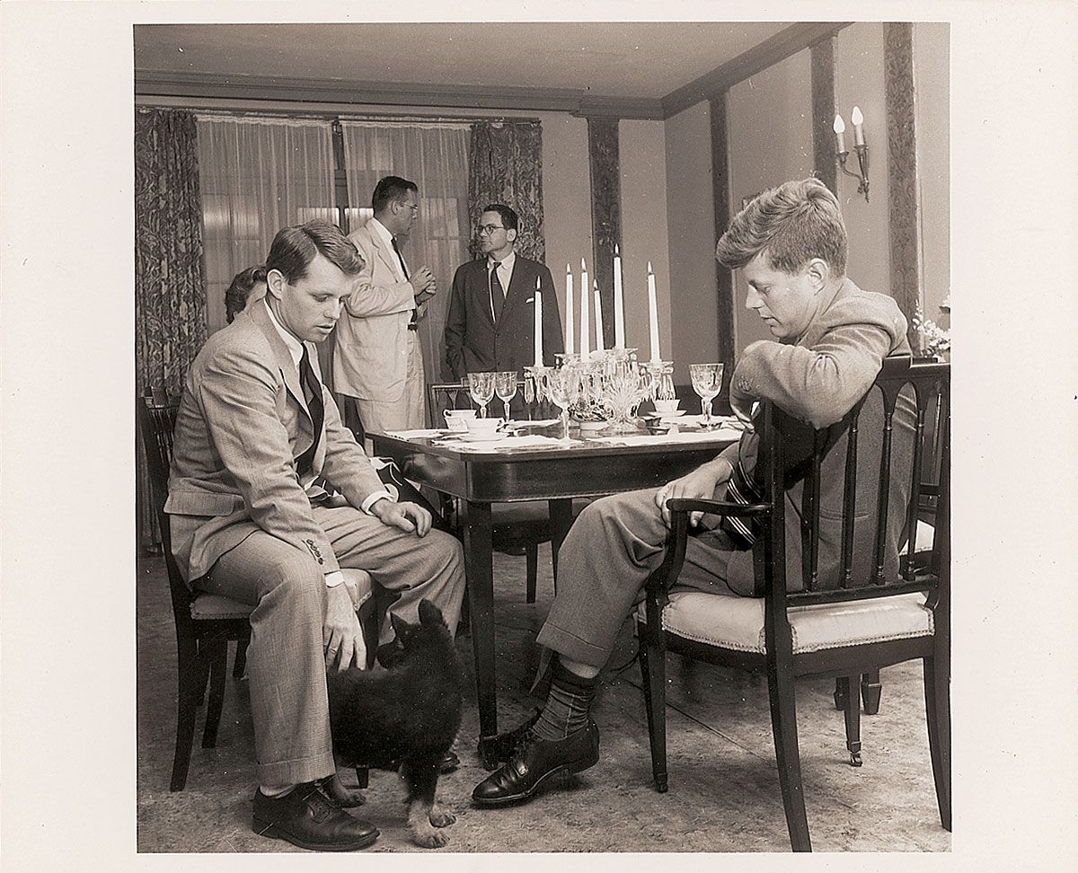 Original first-generation 10 x 8 glossy photo of of John and Robert Kennedy seated at a dinner table, John sitting at the head and Robert reaching down to pet a dog, with Ethel hidden by his side and close friend Lem Billings talking with another gentleman across the room. Reverse of photo bears a Three Lions Inc. stamp. In fine condition. John and Jackie much preferred small dinners with close friends to the official parties that so frequently consumed their evenings. According to Suero, the couple was joined by four guests on this particular evening—Robert, Ethel, Lem, and an unidentified gentleman—and two dogs, including Bobby and Ethel’s German shepherd puppy shown in this picture. A wonderful image of the brothers in a casual moment after dinner. Published in Camelot at Dawn, Johns Hopkins University Press, 2001.