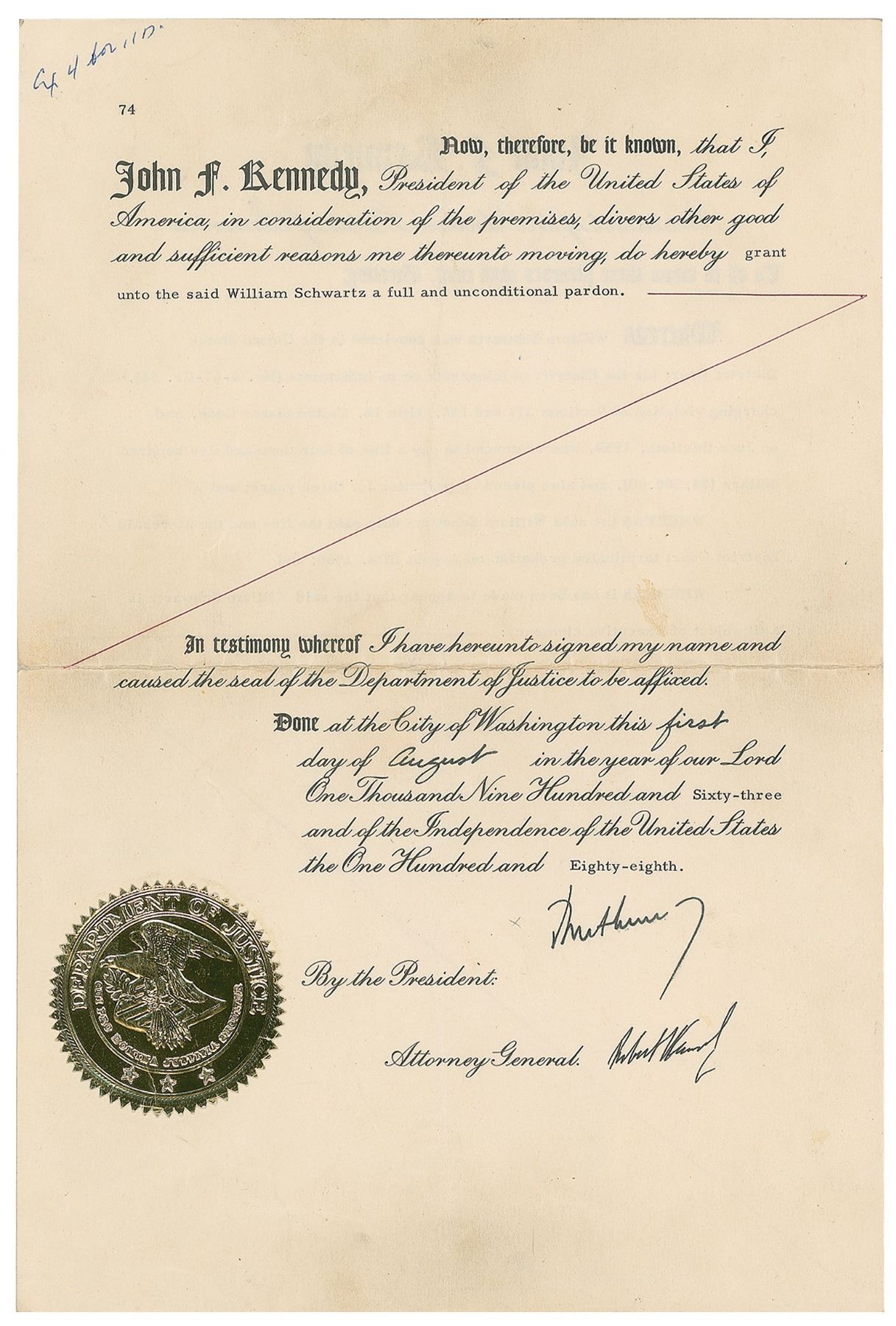 Exceptional partly-printed DS as president, signed “John F. Kennedy" as president and "Robert F. Kennedy" as attorney general, one page both sides, 9 x 13.5, August 1, 1963. A presidential pardon of William Schwartz, in part: "Whereas William Schwartz was convicted in the United States District Court for the District of Minnesota on an indictment (No. 4–57–Cr. 56), charging violation of Sections 371 and 152, Title 18, United States Code, and on June thirtieth, 1958, was sentenced to pay a fine of four thousand five hundred dollars ($4,500.00), and also placed on probation for three years; and whereas the said William Schwartz duly paid the fine and the aforesaid District Court terminated probation on August fifth, 1960; and whereas it has been made to appear that the said William Schwartz is a fit object of Executive clemency: Now, therefore, be it known, that I, John F. Kennedy, President of the United States of America, in consideration of the premises, divers other good and sufficient reasons me thereunto moving, do hereby grant unto said William Schwartz a full and unconditional pardon." Signed boldly at the conclusion by President John F. Kennedy, and by his brother, Attorney General Robert F. Kennedy. Lower left corner retains the golden Department of Justice seal. In very good to fine condition, with light soiling and creasing.