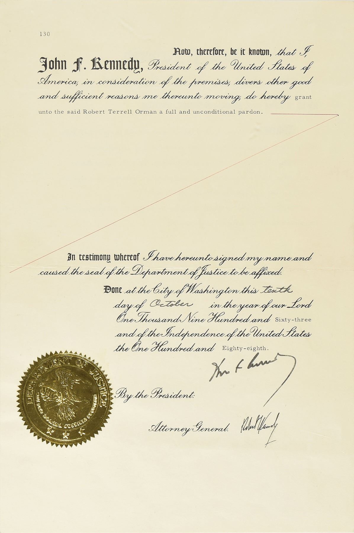 President John F. Kennedy and Robert Kennedy signed pardon, with large-format Jacques Lowe 'Brothers' photograph of John and Robert Kennedy. President Kennedy grants a "full and unconditional pardon" to a convicted smuggler just five weeks before his assassination, also signed by Attorney General Robert F. Kennedy.