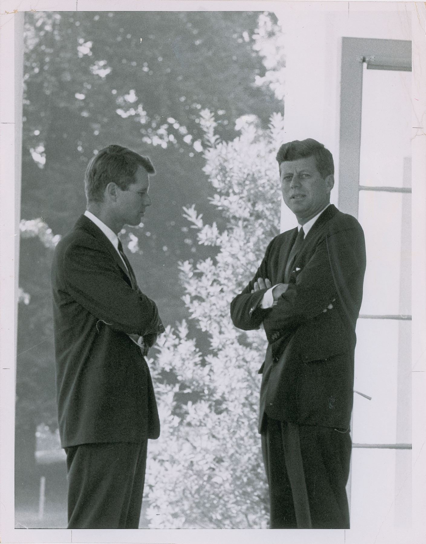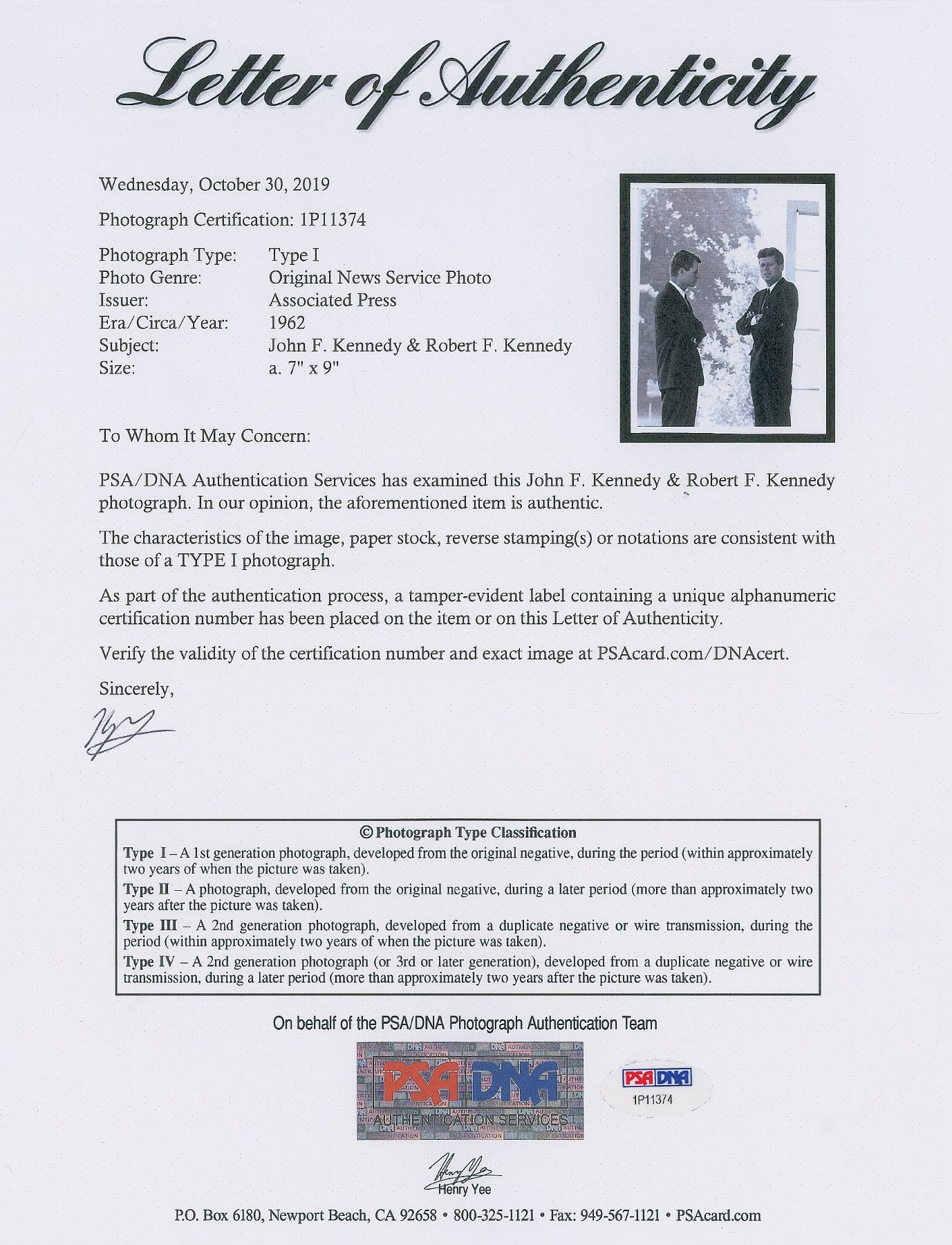 Original vintage glossy 7 x 9 'Type 1' Associated Press news service photograph of President John F. Kennedy conferring with his brother, Attorney General Robert F. Kennedy, outside the White House on October 1, 1962, during the buildup of international tensions that developed into the Cuban Missile Crisis later that month. Reverse bears an AP Newsfeatures stamp. In very good condition, with overall creasing, and staple holes to the upper left corner. Accompanied by a full letter of authenticity from PSA/DNA.