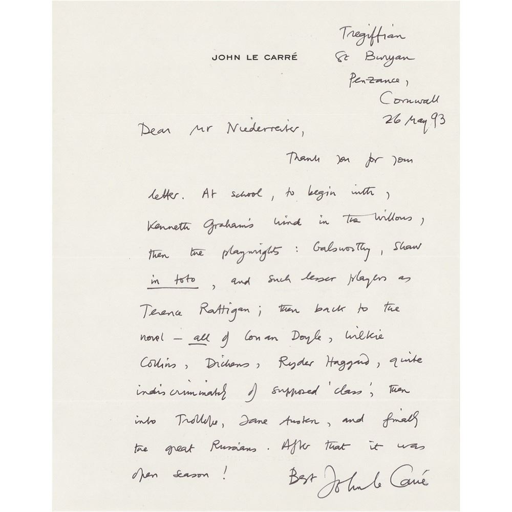 ALS, one page, 8 x 10, personal letterhead, May 26, 1993. Letter describing some of his favorite authors, in part: "At school, to begin with, Kenneth Graham's Wind in the Willows, then the playwrights: Galsworthy, Shaw in toto, and such lesser players as Terence Rattigan; then back to the novel—all of Conan Doyle, Wilkie Collins, Dickens, Ryder Haggard, quite indiscriminately of supposed 'class,' then into Trollope, Jane Austen, and finally the great Russians. After that it was open season!" In fine condition.