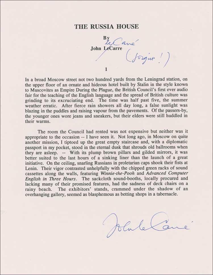 Souvenir typescript, one page, 8.5 x 11, signed in blue ink. The opening passage of The Russia House, beginning with “In a broad Moscow street not two hundred yards from the Leningrad station, on the upper floor of an ornate and hideous hotel built by Stalin in the style known to Muscovites as Empire. During the Plague, the British Council’s first ever audio fair for the teaching of the English language and the spread of British culture was grinding to its excruciating end.” Le Carré has also corrected (adding an apology) the misspelling of his typed name. In fine condition. RRAuction COA.