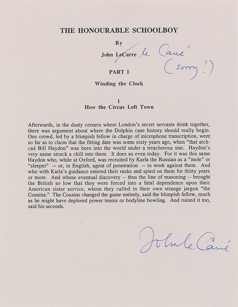Souvenir typescript, one page, 8.5 x 11, signed at the bottom in blue ink. The opening passages of The Honourable Schoolboy beginning: “Afterwards, in the dusty corners where London’s secret servants drink together, there was an argument about where the Dolphin case history should really begin.” Le Carré has also corrected (adding an apology) the misspelling of his typed name. In very fine condition.