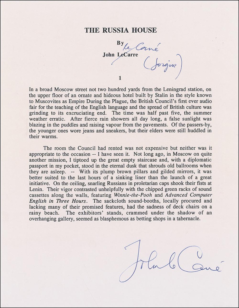 Souvenir typescript, signed at the bottom in blue ballpoint, “John le Carré,” one page, 8.5 x11. Two paragraphs from the opening of Chapter One of The Russia House. In part: “In a broad Moscow street not two hundred yards from the Leningrad station, on the upper floor of an ornate and hideous hotel built by Stalin in the style known to Muscovites as Empire During the Plague, the British Council’s first ever audio fair for the teaching of the English language and the spread of British culture was grinding to its excruciating end.” Le Carré has also corrected the misspelling of the author’s name, drawing a slash through “LeCarre,” writing “le Carré” and parenthetically adding “forgive.” In fine condition.