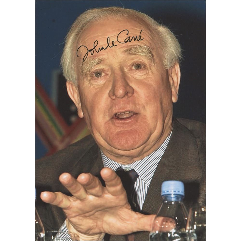 Color glossy 4 x 5.5 photo of the great spy author giving a talk, signed across his forehead in black felt tip, "John le Carre." In fine condition.