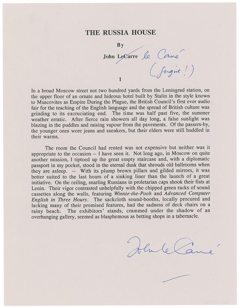 Souvenir typescript, signed at the bottom in blue ink, “John le Carré,” one page, 8.5 x 11. Two paragraphs from the opening of Chapter One of The Russia House. In part: “In a broad Moscow street not two hundred yards from the Leningrad station, on the upper floor of an ornate and hideous hotel built by Stalin in the style known to Muscovites as Empire During the Plague, the British Council’s first ever audio fair for the teaching of the English language and the spread of British culture was grinding to its excruciating end.” Le Carré has also corrected the misspelling of the author’s name, drawing a slash through “LeCarre,” writing “le Carré” and parenthetically adding “forgive.” In fine condition.