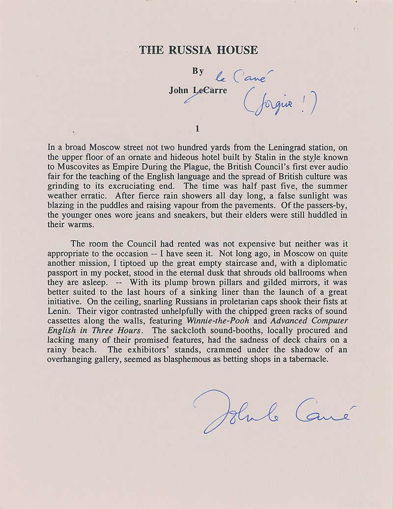 Souvenir typescript, signed at the bottom in blue ink, “John le Carré,” one page, 8.5 x 11. Two paragraphs from the opening of Chapter One of The Russia House. In part: “In a broad Moscow street not two hundred yards from the Leningrad station, on the upper floor of an ornate and hideous hotel built by Stalin in the style known to Muscovites as Empire During the Plague, the British Council’s first ever audio fair for the teaching of the English language and the spread of British culture was grinding to its excruciating end.” Le Carré has also corrected the misspelling of the author’s name, drawing a slash through “LeCarre,” writing “le Carré” and parenthetically adding “forgive.” In fine condition.