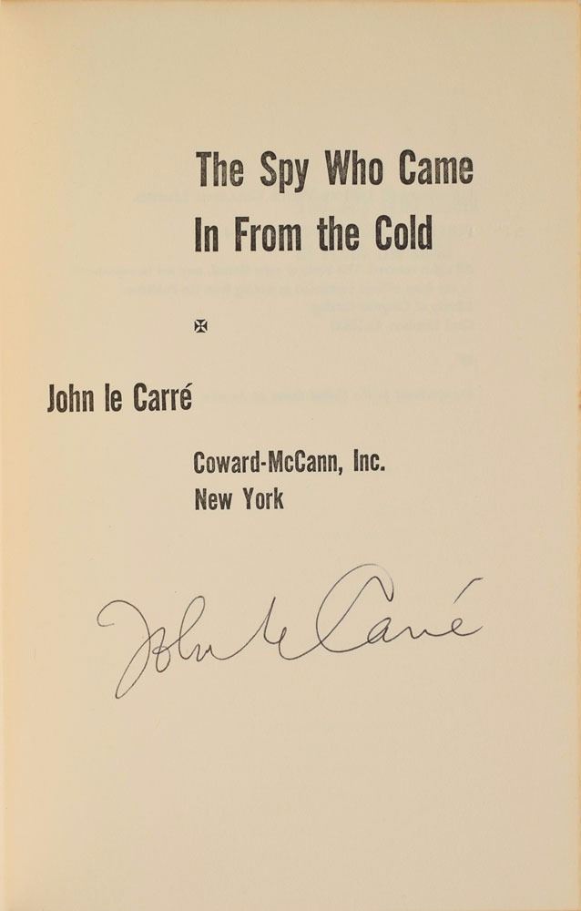 Signed book: The Spy Who Came In From the Cold. First American edition. NY: Coward-McCann, Inc., 1964. Hardcover, 6 x 8.5, 256 pages. Signed on the title page in black felt tip, "John le Carre." Autographic condition: fine. Book condition: VG/None, with edgewear, a small annotation to first free end page, and some scattered marks to boards.