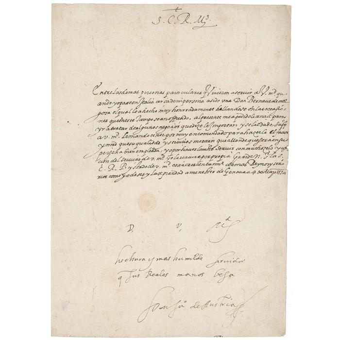 Traditionally known as Don John of Austria, and in Spanish as Don Juan de Austria (1547-1578), was an illegitimate son of Holy Roman Emperor Charles V. He became a military leader in the service of his half-brother, Philip of Spain and is best known for his naval victory at the Battle of Lepanto in 1571. Incredibly rare LS in Italian, signed “Don Ju[an] de Austria,” one page, 8.25 x 11.5, May 4, 1574. Letter to King Philip II of Spain recommending that a secretary to the BC "Don Bernau of the qual Melgosa very honorably as a fact found in the BARGAINS that at this time are offrecido." At the conclusion, he adds in his own hand, "D. V. Mgd meanest creature and his royal hands seruidor q kisses Don Ju Austria." In very good condition, with intersecting mailing folds, light creasing and wrinkling, small separation to one horizontal fold, and some mild toning and foxing. Of the utmost rarity, with only two documents by scribal hand at auctions in recent decades. RRAuction COA.