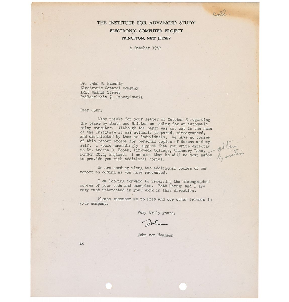 Von Neumann writes to John Mauchly, the designer of ENIAC, the first electronic general-purpose computer. A founding figure in computer science and the inventor of linear programming, von Neumann consulted on the development of both the ENIAC and EDVAC computers. In the letter, he mentions Herman Goldstine, another ENIAC designer, as well as Andrew Booth and Kathleen Britten, British computer scientists who developed the first electronic computers in the United Kingdom. A fine and decidedly scarce letter with excellent content regarding the work of other pioneering computer scientists.