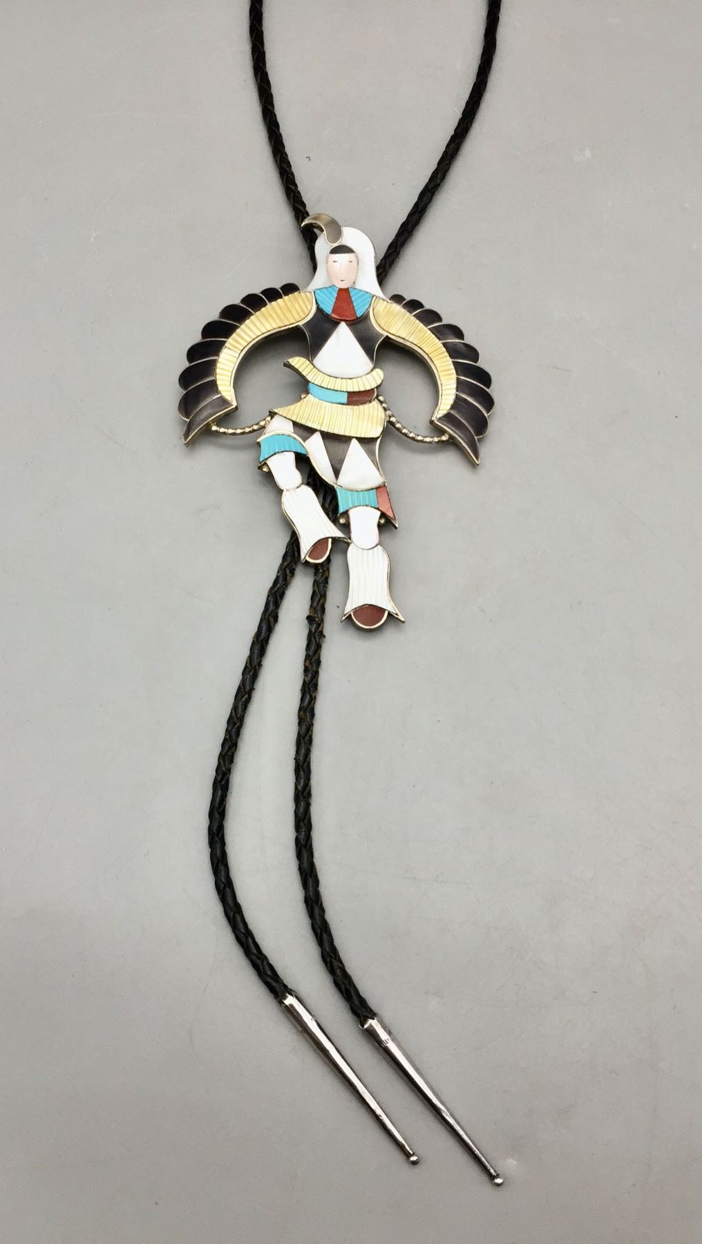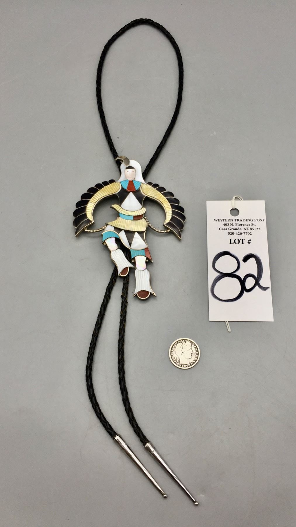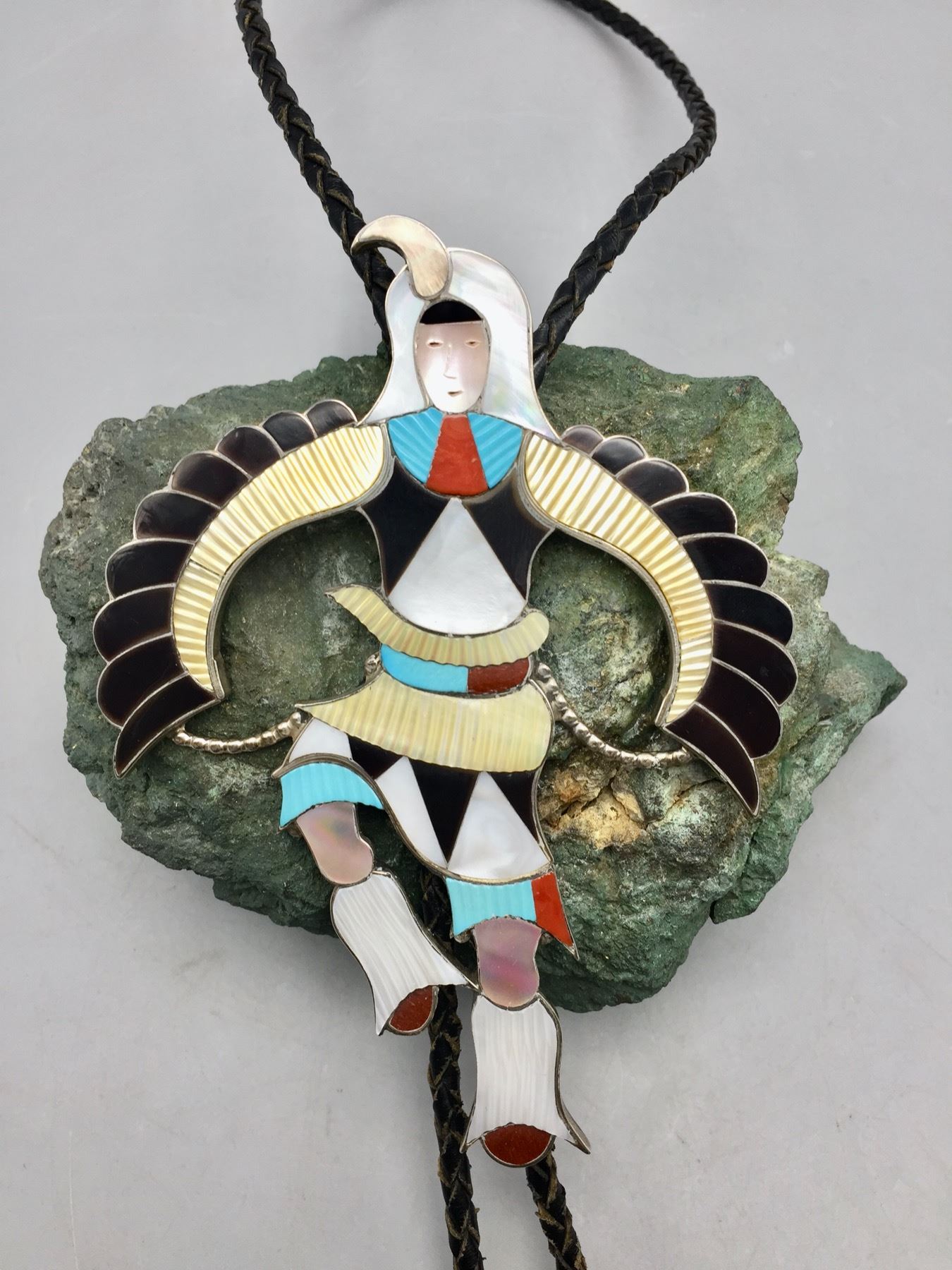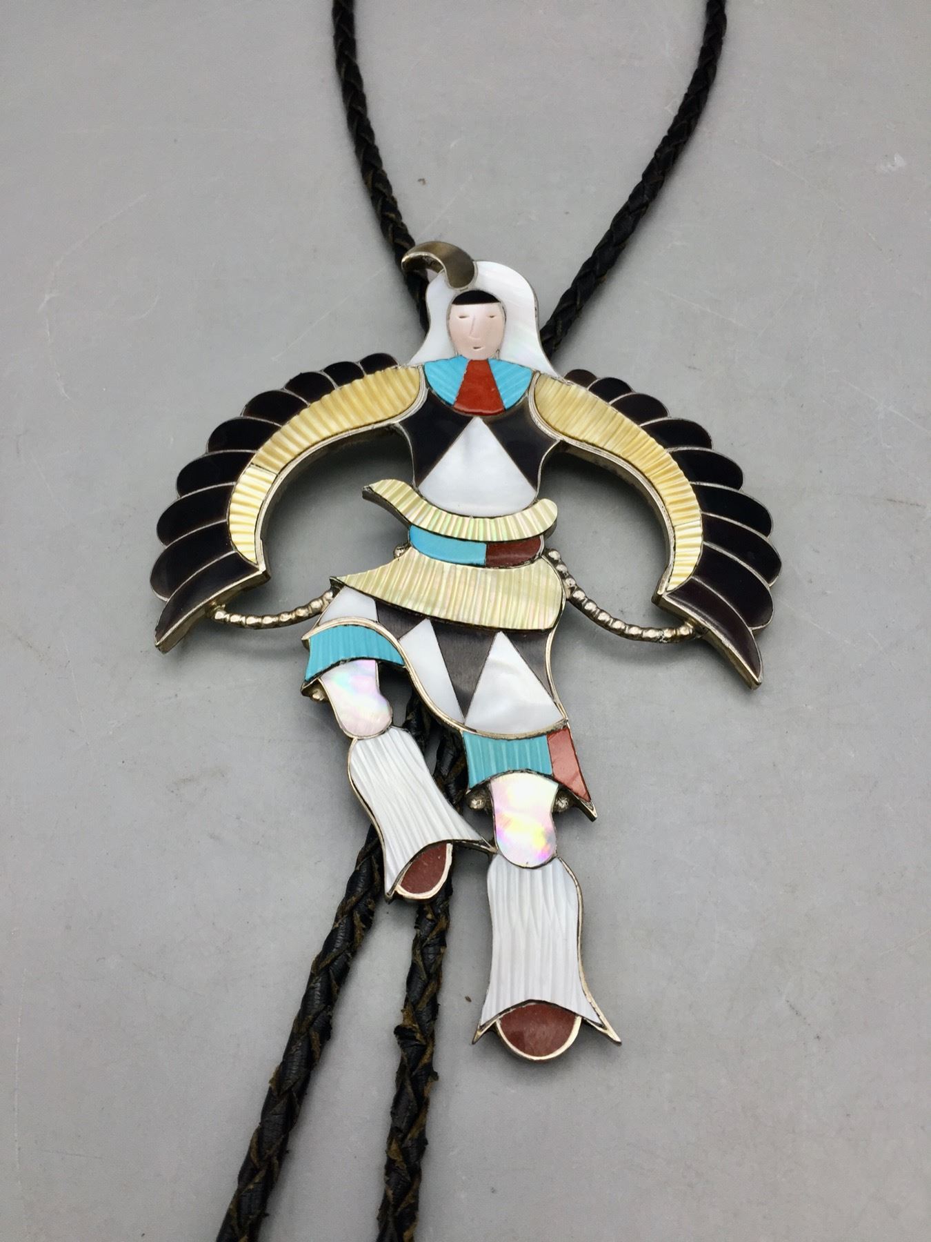 Description: Presented for sale in this lot is a stunning Johnathan Beyuka Zuni inlay bolo. It features a detailed eagle dancer set with turquoise, coral, onyx, mother of pearl and shell in sterling silver. Maker: Johnathan Beyuka, Zuni. Approx. Age: Circa 1980s. Size: Cord measures 38 inches long with tips. Slide measures 5-1/4 inches long x 3-1/2 inches wide. Weighs 75.5 grams. Condition: Good for its age, normal wear expected. Please look closely at the pictures - they are an important part of our description. Shipping: There will be a $5 handling, packaging fee for shipping this lot. The actual cost of postage will be added on top of that.