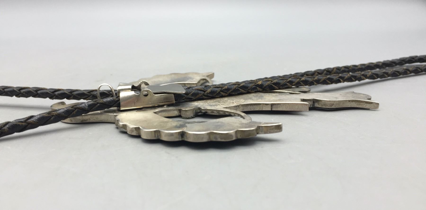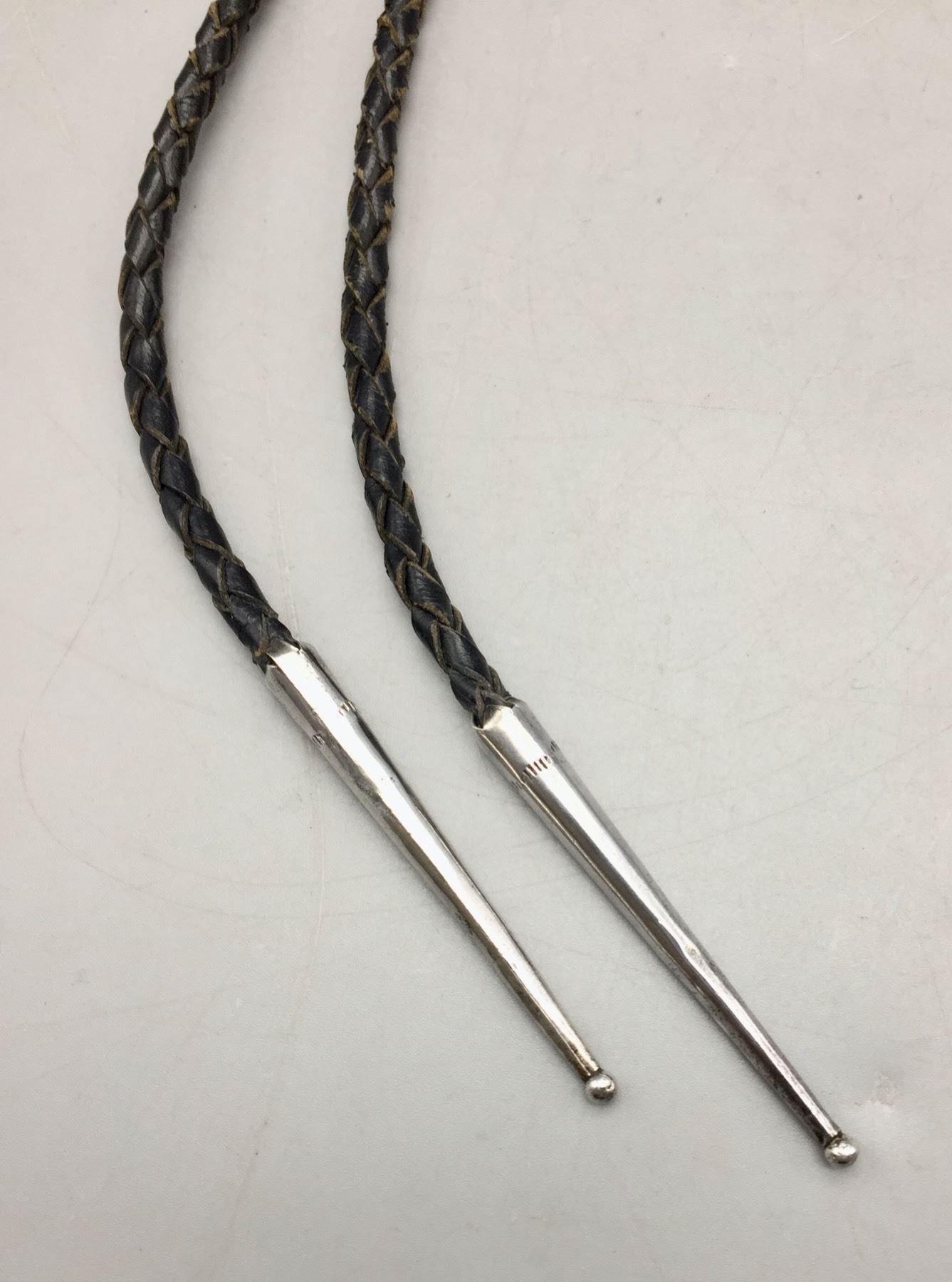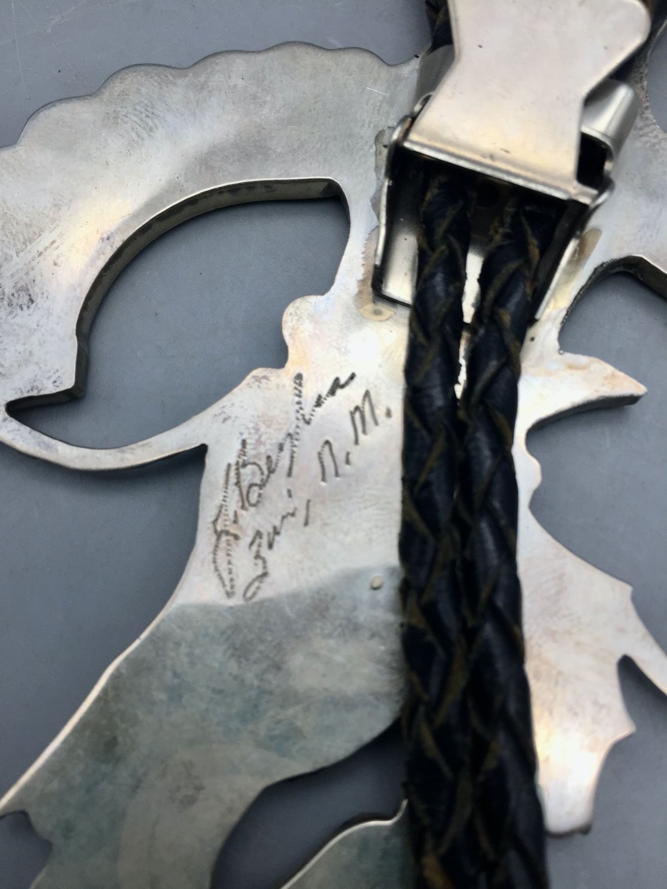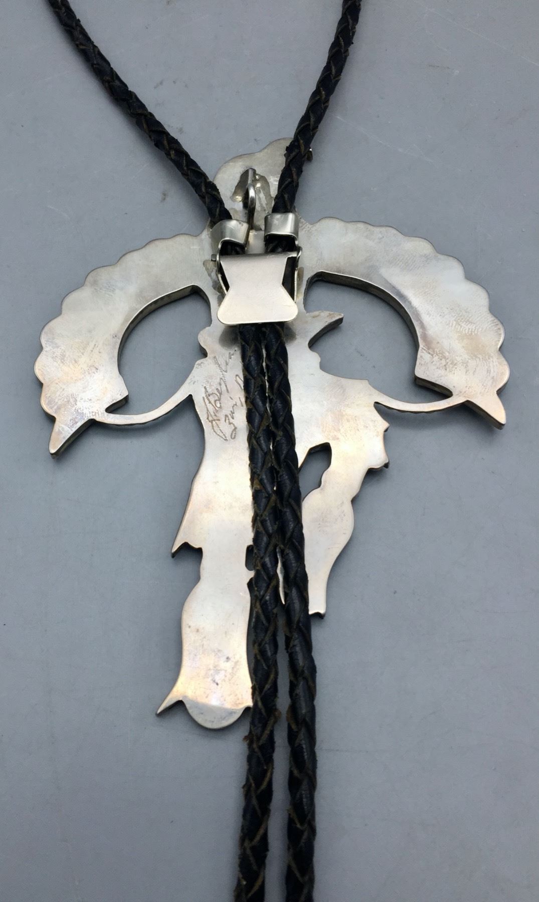Description: Presented for sale in this lot is a stunning Johnathan Beyuka Zuni inlay bolo. It features a detailed eagle dancer set with turquoise, coral, onyx, mother of pearl and shell in sterling silver. Maker: Johnathan Beyuka, Zuni. Approx. Age: Circa 1980s. Size: Cord measures 38 inches long with tips. Slide measures 5-1/4 inches long x 3-1/2 inches wide. Weighs 75.5 grams. Condition: Good for its age, normal wear expected. Please look closely at the pictures - they are an important part of our description. Shipping: There will be a $5 handling, packaging fee for shipping this lot. The actual cost of postage will be added on top of that.
