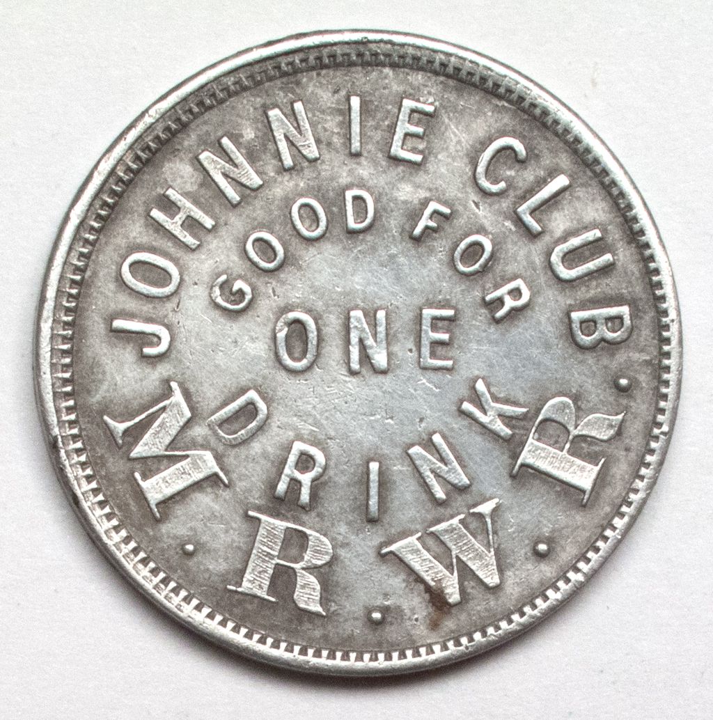 This token takes its name from the city it was located in. Comstock Club, GF one drink, M.R.W.R. Reverse is blank. Strong Strike!City: JohnnieCounty: NyeState: NVDate: