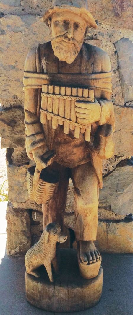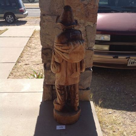 Early 20th Century, Hand carved oak sculpture of Johnny Appleseed, made from single log. Origin unknown. Solid, good condition, no repairs. 39-1/2" tall