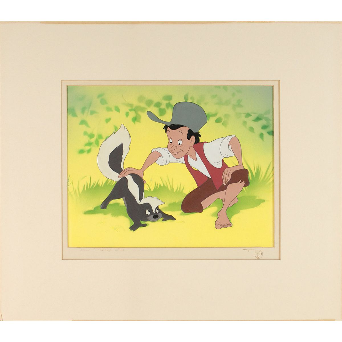(Walt Disney Studios, 1946) Original production cel featuring Johnny Appleseed from Melody Time. The cel is placed on an airbrushed background, prepared at the Disney Studio to be sold at the Courvoisier Galleries. Image of Johnny Appleseed and the skunk measures 7 x 6.25, with a mat opening of 9.5 x 7.25. The original cream-colored mat is notated in pencil “From ‘Melody Time,’” and has its WDP circular stamp. The mat is in turn matted to an overall size of 16 x 14. In fine condition, with some old tape to edges of mat.