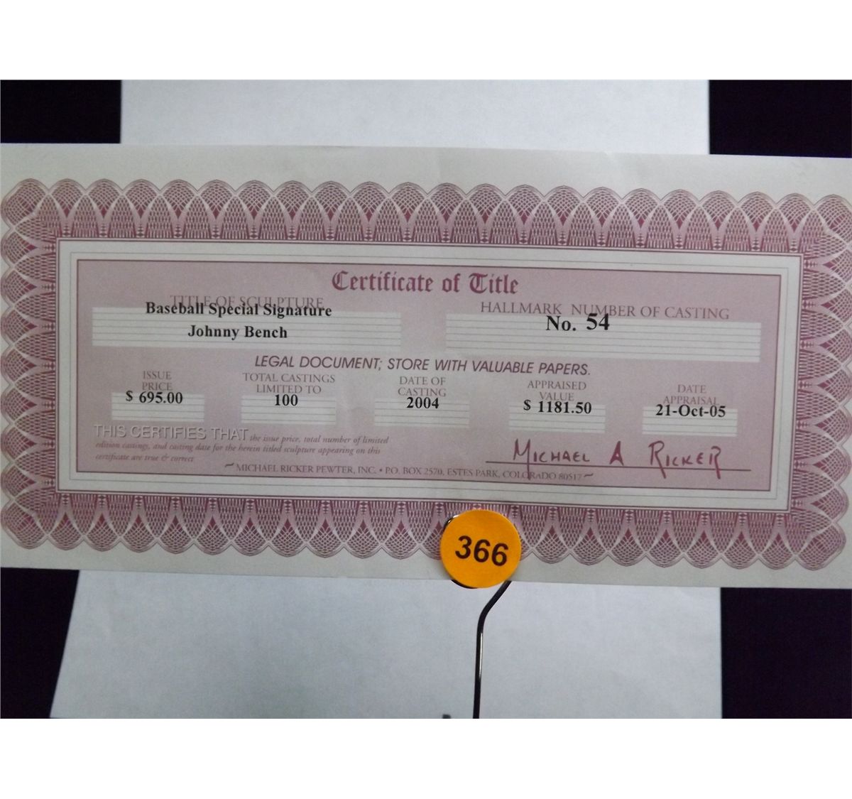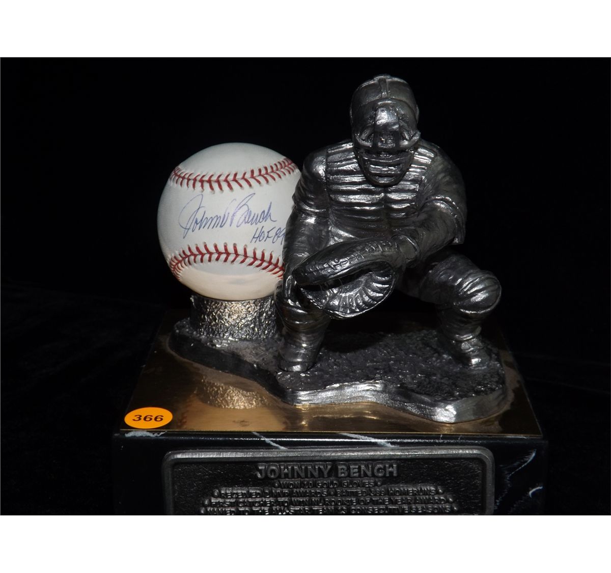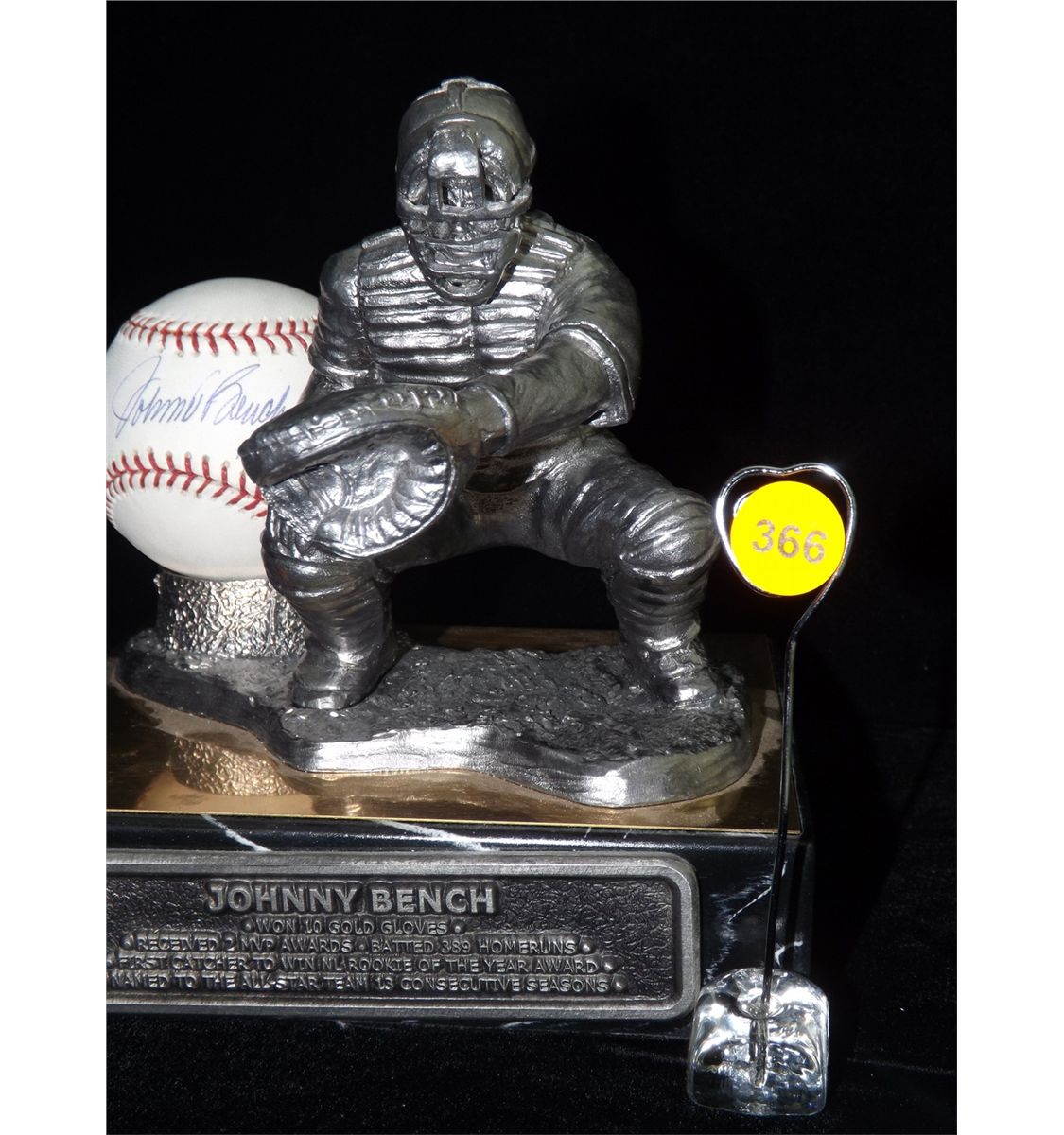 Johnny Bench Pewter Figurine Display Stand with Autographed Ball by Johnny Bench. Display Numbered 54/100. COAs by Michael A. Ricker. Appraised or estimated retail value $1200. All Sales Final. Please see terms and conditions of auction.
