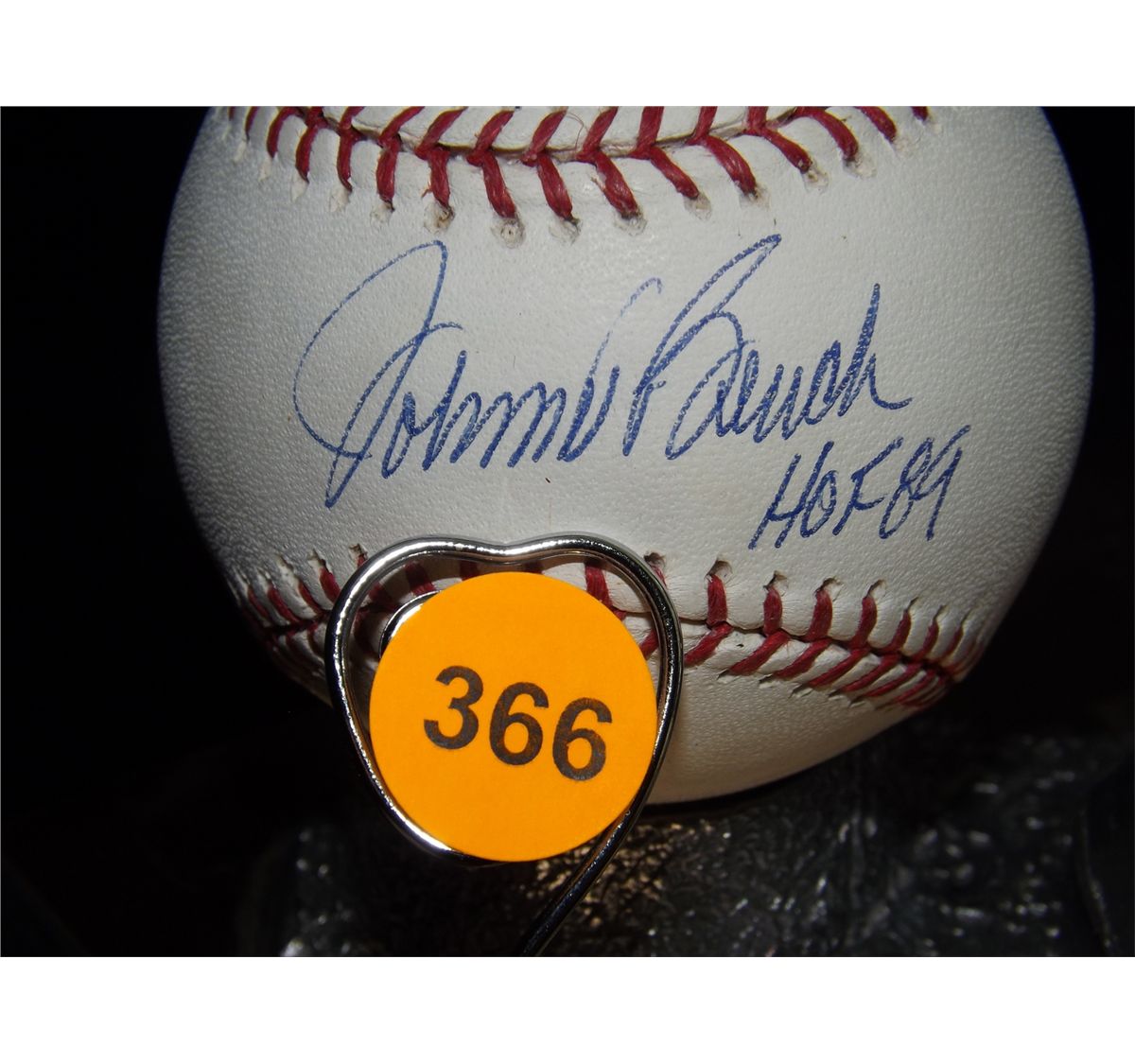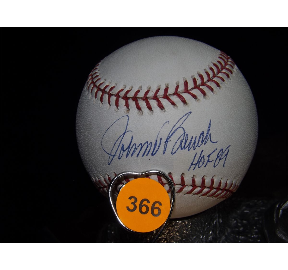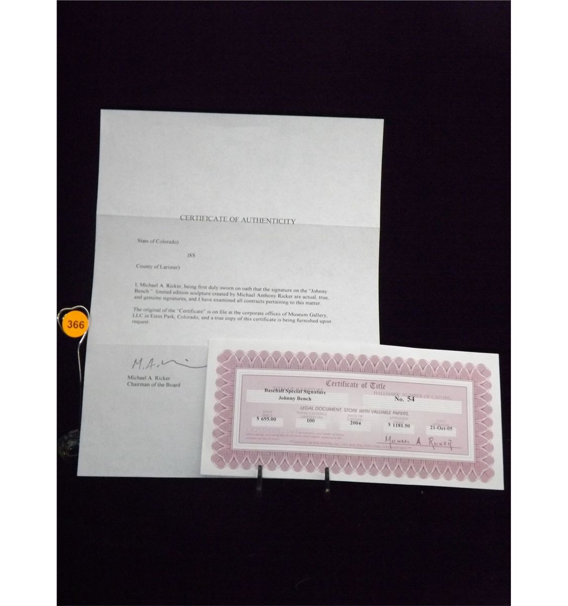 Johnny Bench Pewter Figurine Display Stand with Autographed Ball by Johnny Bench. Display Numbered 54/100. COAs by Michael A. Ricker. Appraised or estimated retail value $1200. All Sales Final. Please see terms and conditions of auction.