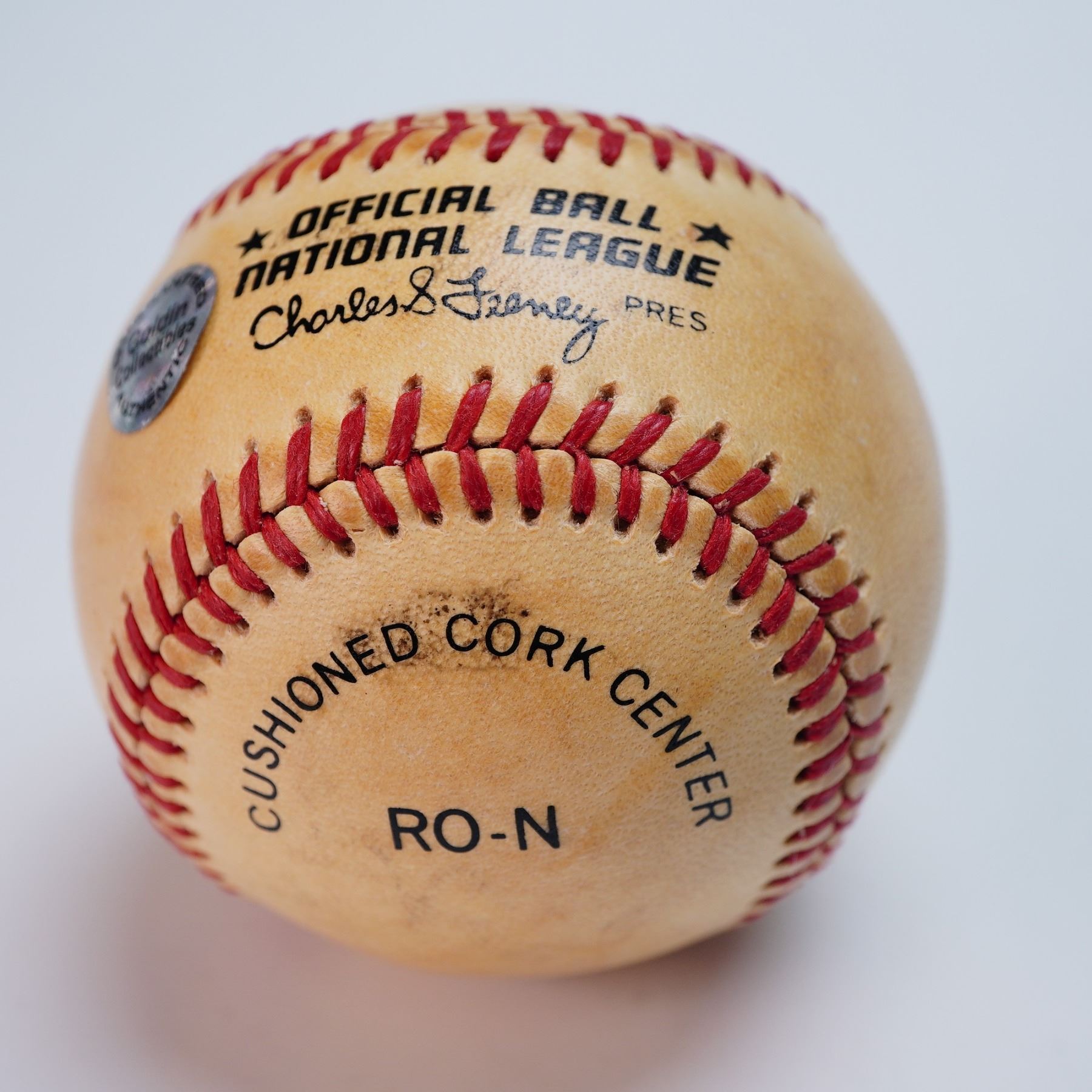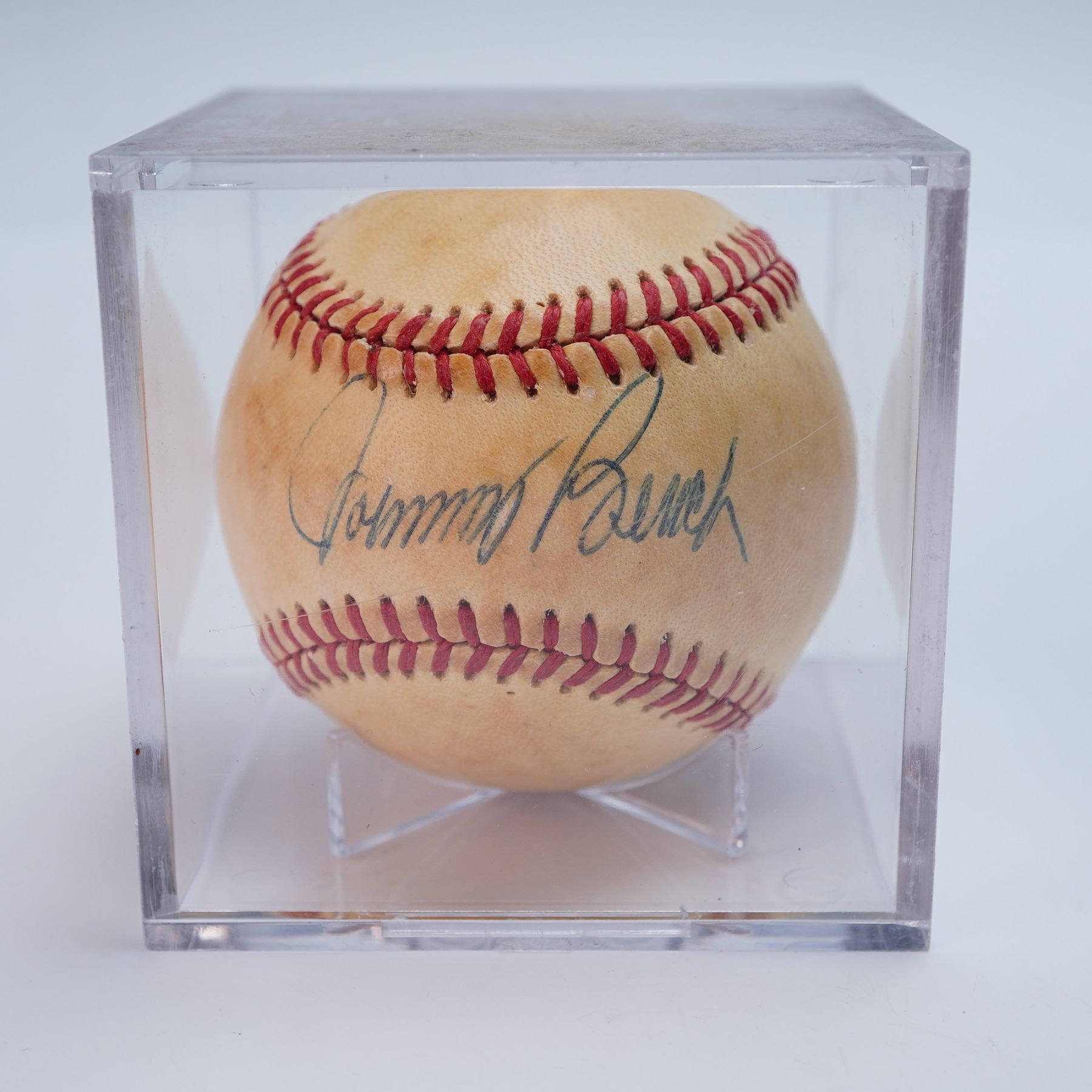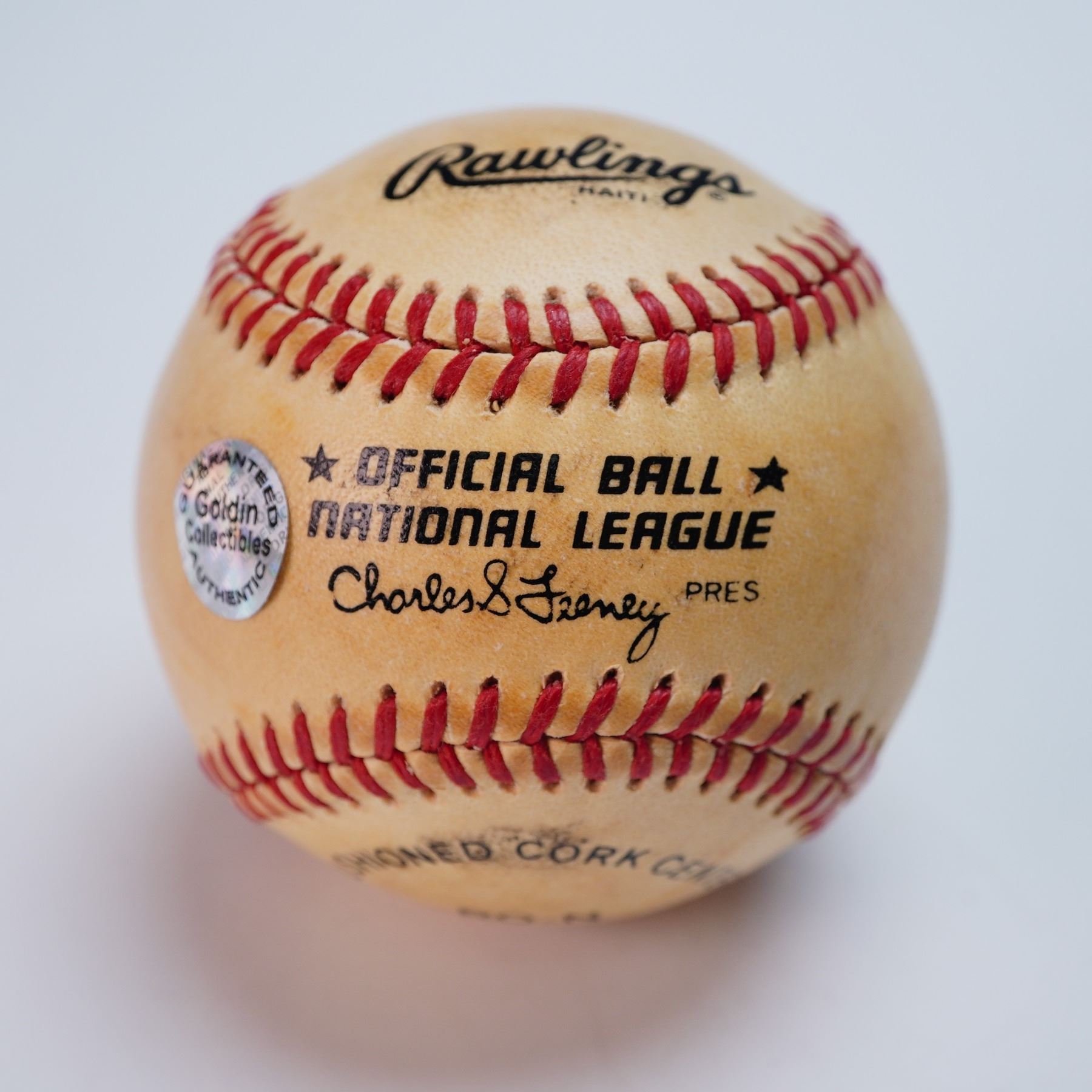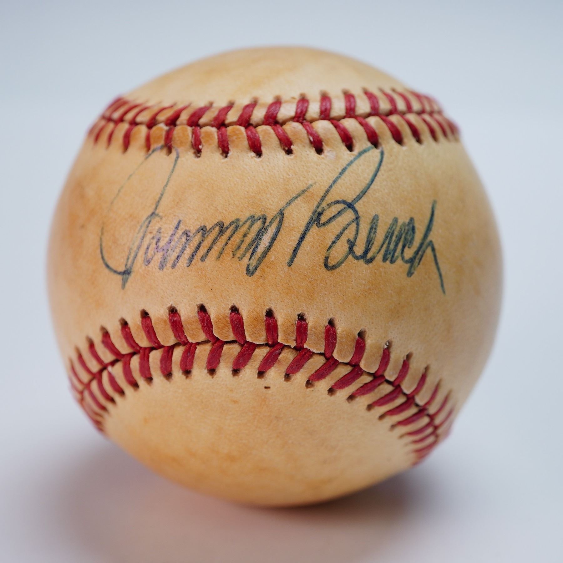 Official Rawlings National League baseball signed in blue ink by Hall of Fame catcher Johnny Bench, featuring red stitching and Charles Feeney's printed signature as NL president. Bench played his entire 17-season MLB career with the Cincinnati Reds and was a key member of the Big Red Machine dynasty, winning two World Series titles and earning 14 All-Star selections. Widely regarded as one of the greatest catchers in baseball history, he was inducted into the Hall of Fame in 1989. Includes a clear display case and Goldin Collectibles authenticity sticker. Measures approx. 3"dia., case measures 3.25"L x 3.25"H.