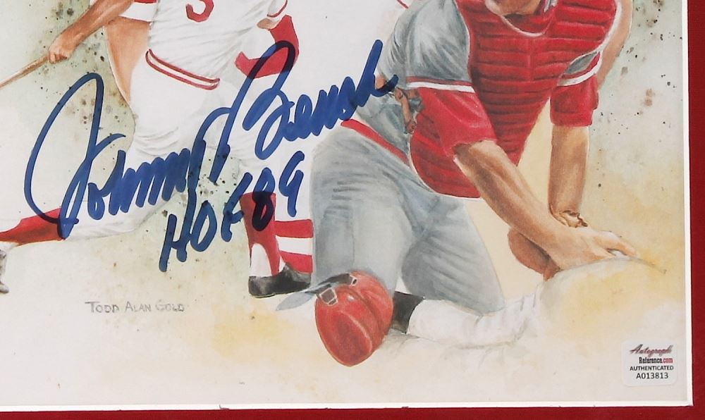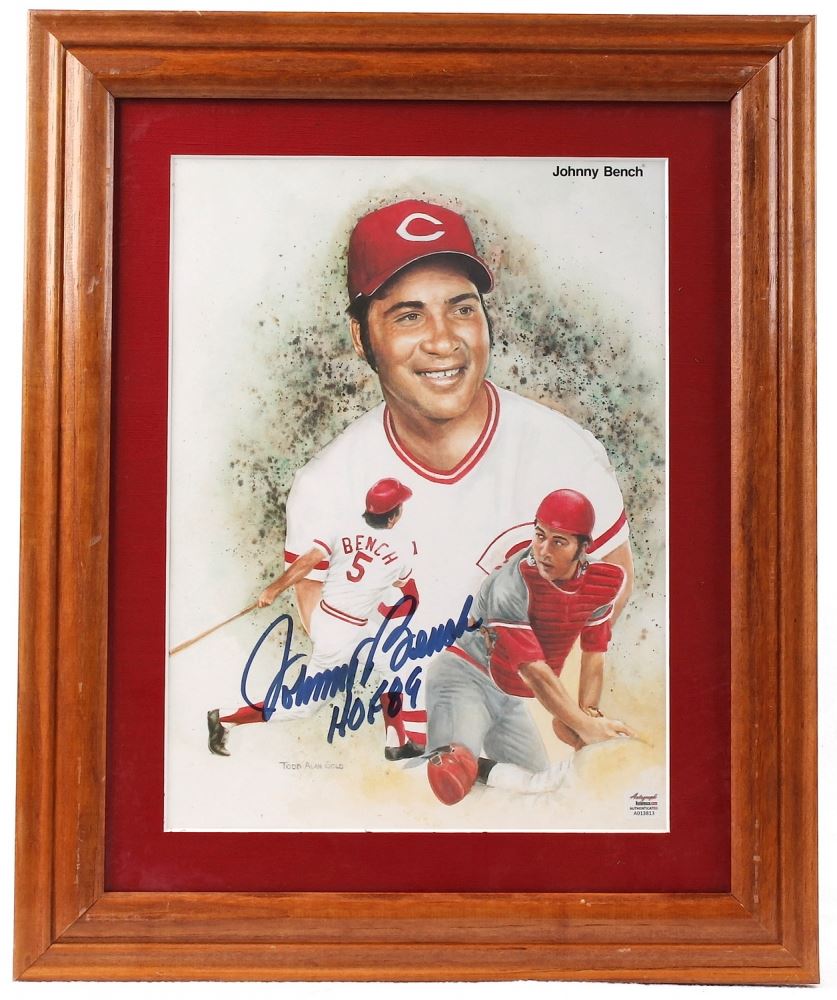 Custom framed photo display measures 14" x 17". Photo has been hand-signed and inscribed in blue ink pen by Johnny Bench (Reds HOF). The autograph includes an official Autograph Reference hologram and matching COA for authenticity purposes.