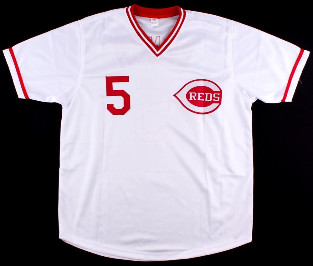 Custom On-field style jersey. Everything sewn on, size XL. Hand signed in silver paint pen by Johnny Bench (HOF). The lot / autograph(s) includes an official James Spence Authentication (JSA) hologram and matching COA for authenticity purposes. The signing of this item was witnessed by JSA.