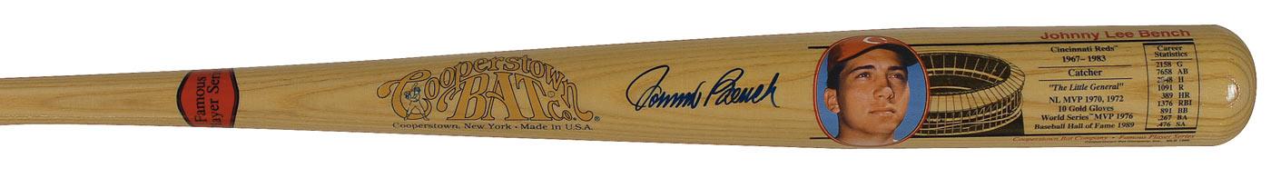 Official limited edition Cooperstown Bat Company Famous Players Series commemorative baseball bat, #261/1,000, signed in blue felt tip on the barrel, “Johnny Bench.” In very fine condition.