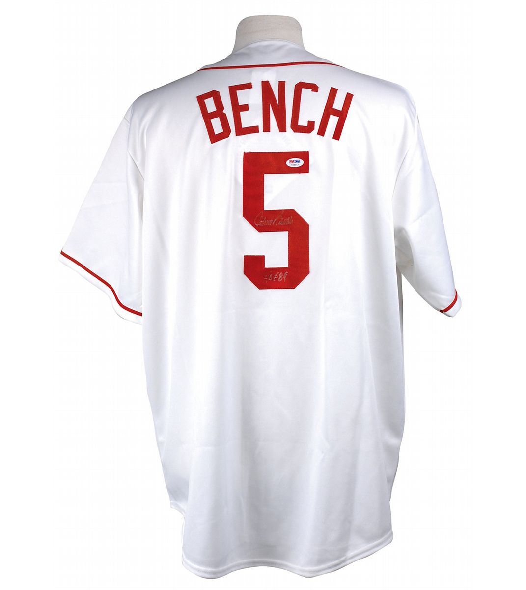 Official Majestic replica Cincinnati Reds baseball jersey, with sewn on letters and numbers, signed in silver ink on the number on the back, “Johnny Bench, HOF 89.” In fine condition, with the signature a shade or two light and a PSA/DNA label affixed to the number. Accompanied by a certificate of authenticity from PSA/DNA.