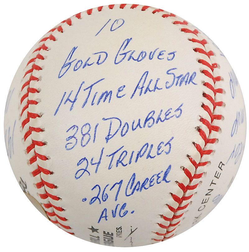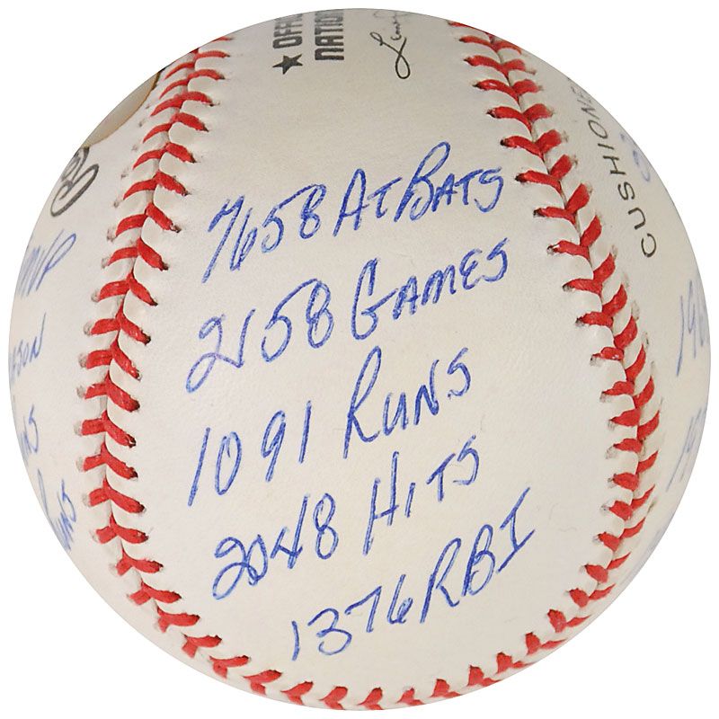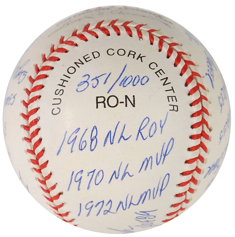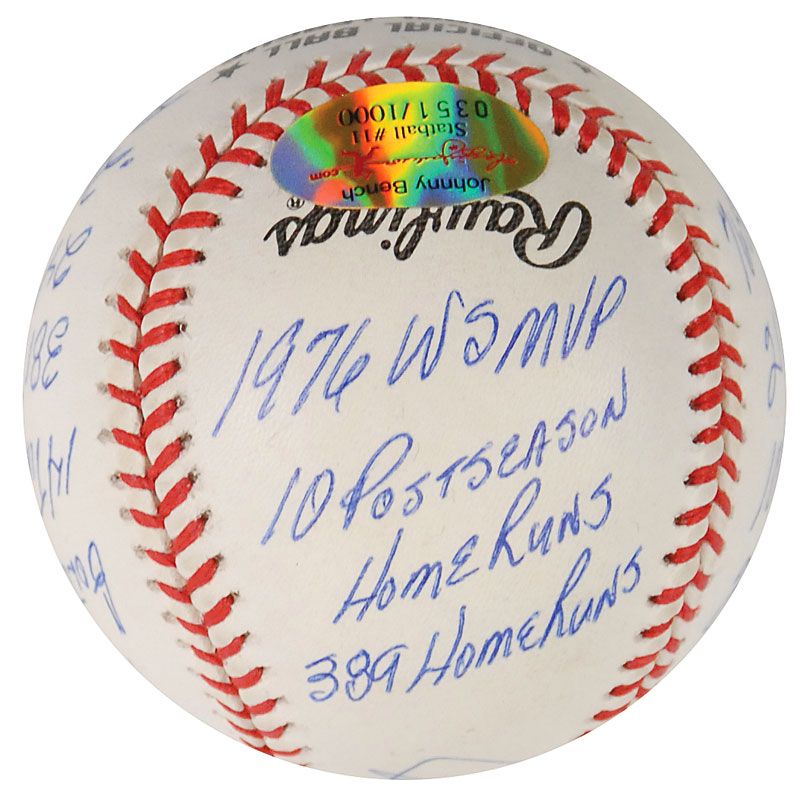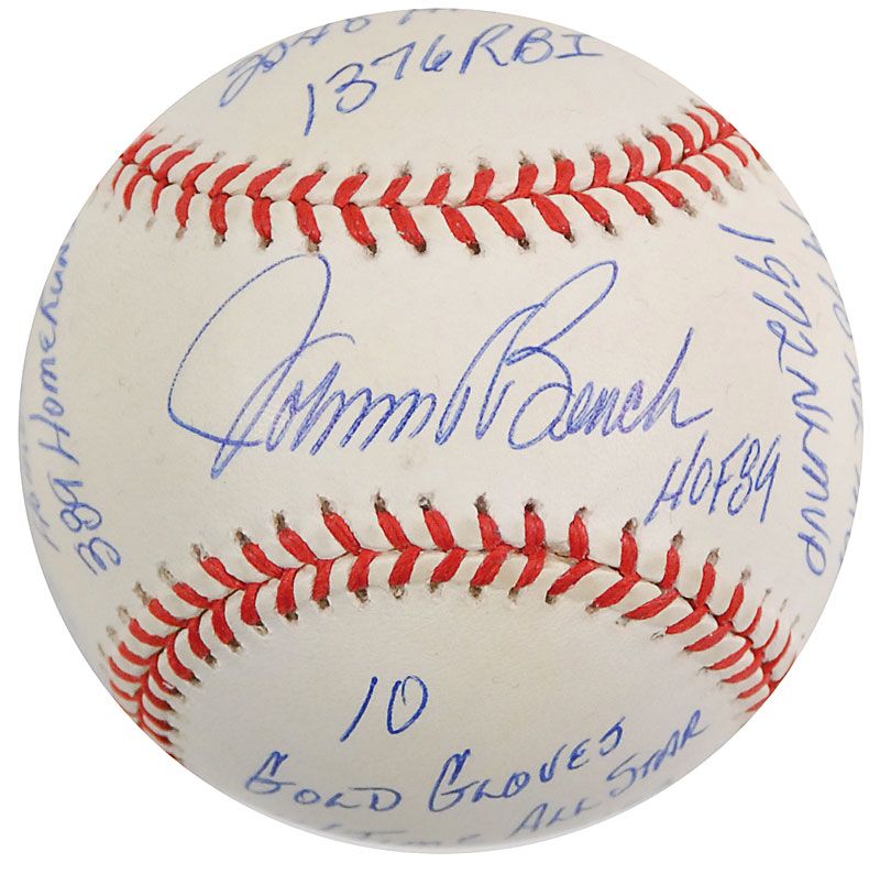 Limited edition official Rawlings National League baseball, numbered 351/1000, signed in blue ballpoint on the sweet spot, “Johnny Bench, HOF 89.” Bench has also filled the side panels with 16 statistics from his career, including “1976 WS MVP,” “389 Home Runs,” “2048 Hits,” “1968 NL ROY,” and “1972 NL MVP.” In fine condition. Accompanied by a certificate of authenticity from Reggie Jackson’s ‘statball’ company, as well as the item’s original velvet bag and box.