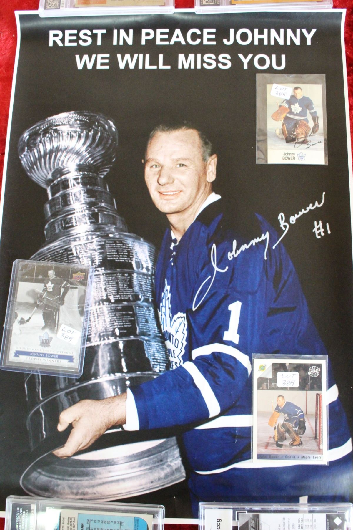 Johnny Bower Print (signed) and Johnny Bower Collector Cards (3)