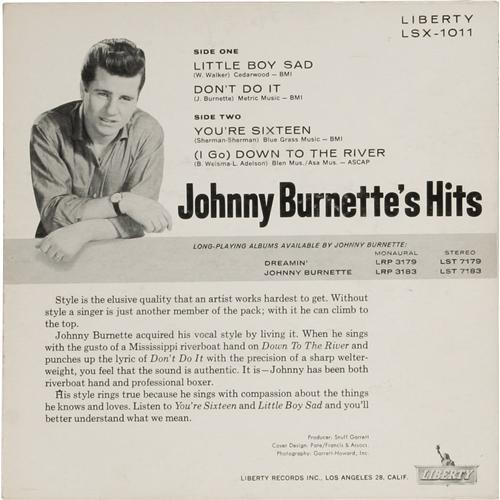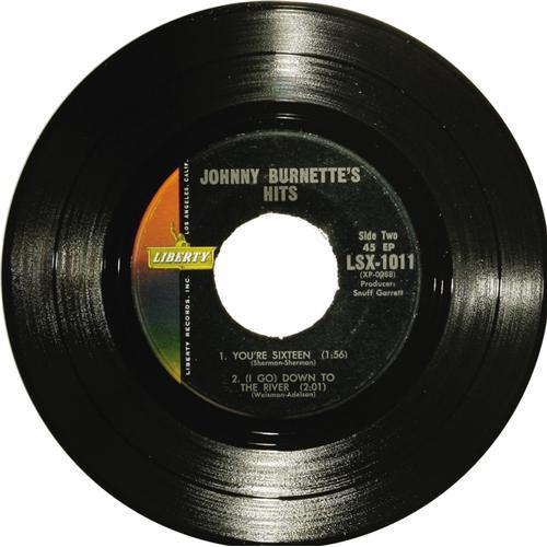 <B>"Johnny Burnette's Hits" EP (Liberty LSX-1011, 1960).</B></I> The second of the groundbreaking Rockabilly's two EPs included his biggest hit "You're Sixteen", plus "Little Boy Sad", "Don't Do It", and "(I Go) Down to the River". Condition: NM 8/ VG-EX 6. <I>From the GRT Collection</B></I>.<BR><BR><b>Shipping:</b> Recordings (<a target="_blank" href="http://www.heritageauctions.com/common/shipping.php">view shipping information</a>)
