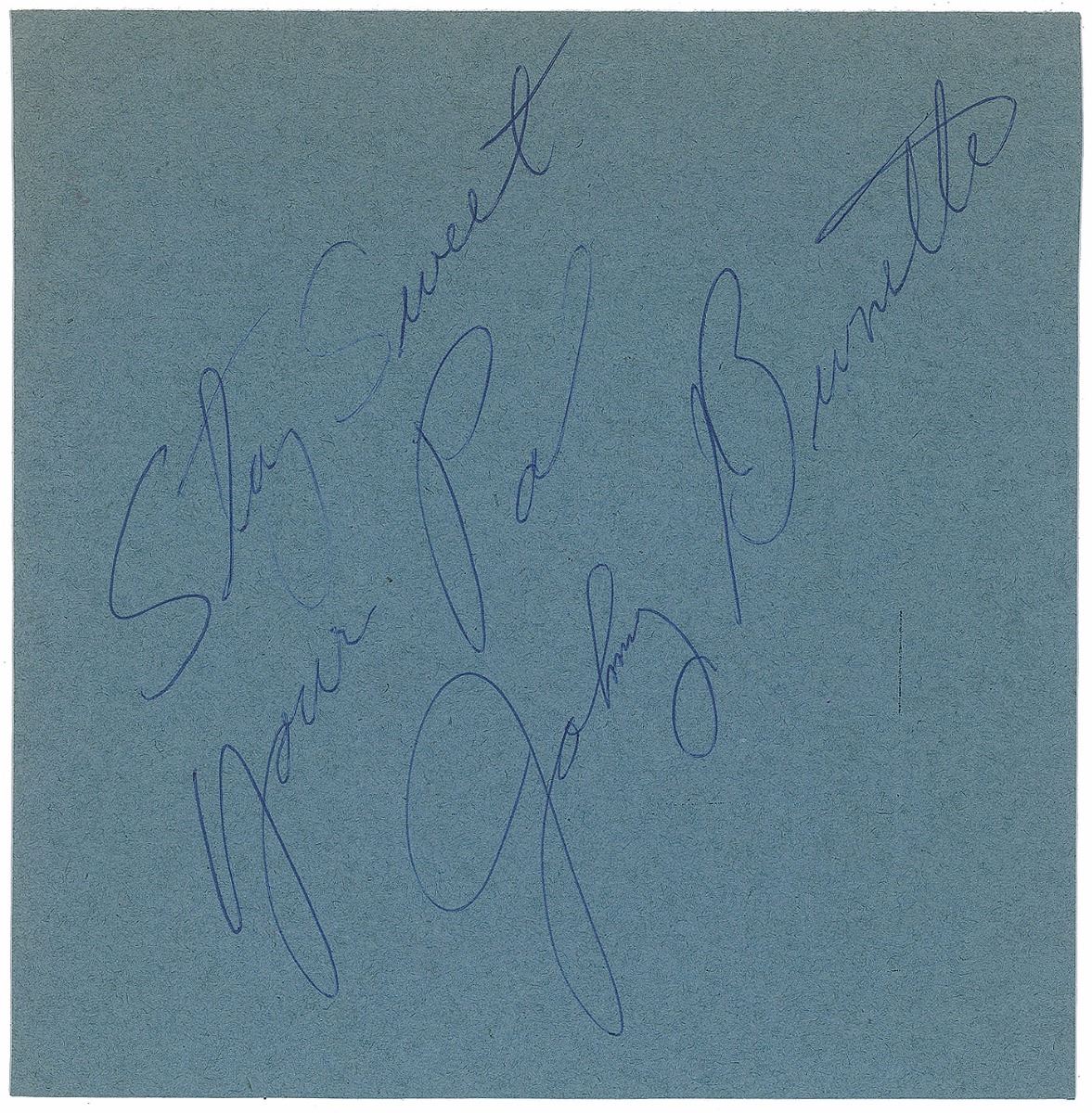 Ballpoint signature, “Stay sweet, your pal, Johnny Burnette,” on a blue 6.5 x 6.5 sheet. In fine condition.