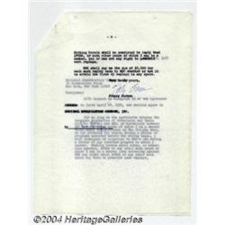 <B>Johnny Carson Autographed Contract.</B></I> This is a signed agreement between Johnny Carson and NBC, dated April 24, 1967, stipulating that NBC would be free to rerun prerecorded episodes of "The Tonight Show" during a performers' strike, and that Carson would receive $4,000 for each rerun. <I>Accompanied by COA from PSA/DNA. </B></I> <BR><BR><B>Important notice:</B> Heritage usually auctions material at the rate of 200-250 lots per hour. On some occasions eBay Live bid software or the Internet may not be able to keep up with the pace of the auction. We recommend placing a realistic absentee bid now as insurance to avoid disappointment. Occasionally the auctioneer may eliminate or reject an eBay Live bid, and the auctioneer may also reopen a lot after the close of the eBay live bidding (usually because we missed an audience bid), and may reject your bid even if it shows you as the winning bidder. By bidding via eBay Live, you agree that Heritage may award the lot to another bidder at its sole discretion under the circumstances described above or any other reasonable circumstances. Since eBay bids are not shown to us until we open the lot on the floor, we treat those bids just like floor bids. In most cases the floor responds before the eBay bid is presented to us, due to Internet lag time, so for consistency we have made it a policy that floor bids are always considered first over tie eBay live bids. Also please note that all Heritage lots purchased through eBay Live carry a 24.5% Buyer's Premium. Please make sure you read the Terms and Conditions before you bid.