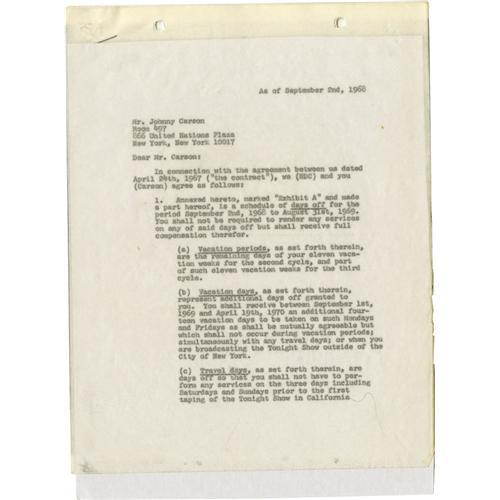<B>Johnny Carson Signed "Tonight Show" Agreement.</B></I> A six-page agreement between NBC and Johnny carson dated September 2, 1968, signed by Carson the last page in black ink. The contract establishes the amount of vacation time Carson received for 1969 and 1970, among other details. In Fine condition with mild to moderate tanning, light wear to the edges, mild soiling on the first page, and staple and binder holes to the top edge. <I>Accompanied by a COA from PSA/DNA.</B></I><I>Accompanied by LOA from PSA/DNA.</B></I><BR><BR><b>Shipping:</b> Small Flat (<a target="_blank" href="http://www.heritageauctions.com/common/shipping.php">view shipping information</a>)