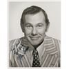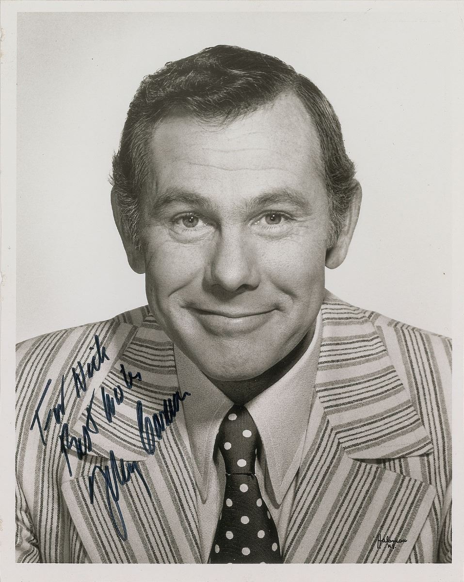 Glossy 8 x 10 Halsman of New York photo of Carson in a striped jacket and polka dotted tie, signed and inscribed in black felt tip, “For Nick, Best wishes, Johnny Carson.” In fine condition.