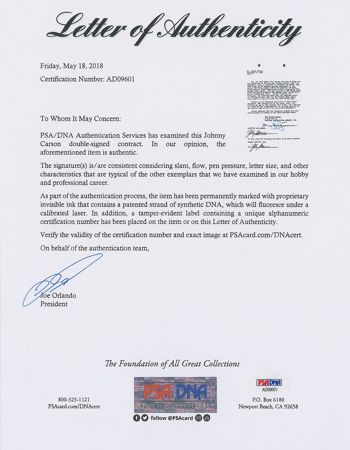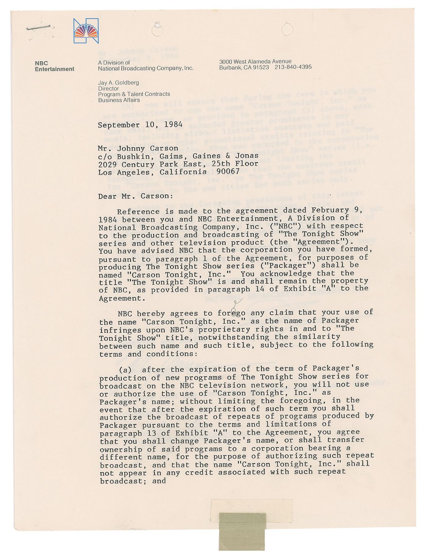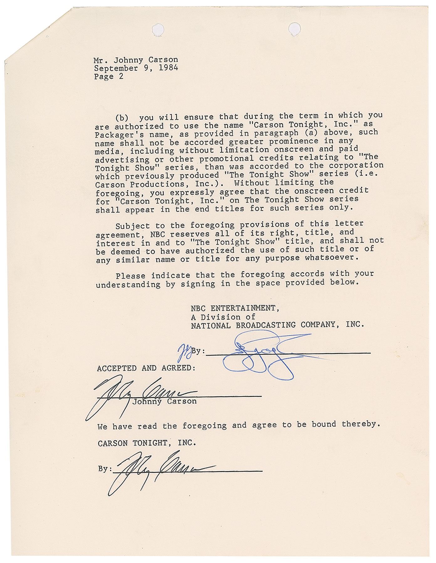 DS, two pages, 8.5 x 11, September 10, 1984. Official letter from NBC Entertainment to Johnny Carson, referencing an agreement from February 9th, which relates to how a corporation he formed, "Carson Tonight, Inc.," will not infringe on NBC's proprietary rights "in and to 'The Tonight Show' title." Signed twice at the conclusion in black ink by Carson. In fine condition, with a cloth tab affixed to first page. Accompanied by a full letter of authenticity from PSA/DNA.