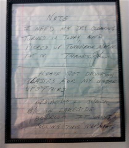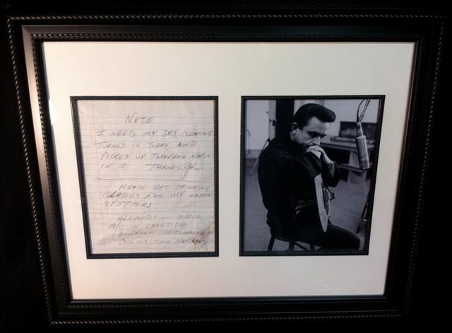 Johnny Cash Hand Written Note - A hand written note in black ballpoint on a sheet of notebook paper, personally written to his house staff saying, "Note. I need my dry cleaning turned in today, and picked up tomorrow morning. Thanks. John. Please get drinking glasses for my water upstairs. Armando - check a/c in lakeside bedroom. It wasn't cooling this morning". Paper was wrinkled and has been flattened. Beautifully framed with a black and white photo of the "Man in Black". Includes documentation. 23" x 19". Oversized item. Additional shipping charges required.