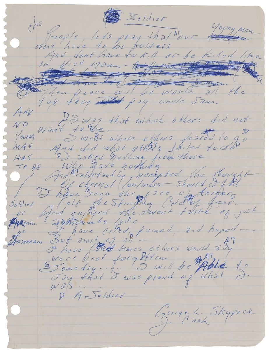 Cash’s handwritten working lyrics to the unpublished song “Soldier,” one page, lightly-lined, 8.5 x 11, signed at the conclusion, “J. Cash.” Cash pens four lines, in full: “People, let’s pray that all our young men / Won’t have to be soldiers / And don’t have to kill or be killed like in Vietnam / Then peace will be worth all the tax they pay Uncle Sam.” Cash continues by penning the famous George L. Skypeck poem, ‘Soldier,’ in full: “I was that which others did not want to be / I went where others feared to go / and did what others failed to do / I asked nothing from those who gave nothing / and reluctantly accepted the thought of eternal loneliness—should I fail / I have seen the face of terror / felt the stinging cold of fear / and enjoyed the sweet taste of a moment's love / I have cried, pained, and hoped… / But most of all— / I have lived times others would say were best forgotten / Someday…I will be able to say that I was proud of what I was… / a soldier. George L. Skypeck.” Cash has made numerous corrections and emendations throughout. In very good to fine condition. One of America's great military-historical commemorative artists, George Skypeck was a Special Warfare and Senior Intelligence Advisor who attained numerous medals during his two combat tours of the Vietnam War. Not long after he was released from a Boston VA hospital in the early 1980s, Skypeck received a telephone call from Johnny Cash, who asked the veteran for permission to use his poem ‘Soldier’ in a song. After Cash sang a rendition over the phone, Skypeck agreed, but the singer’s ailing health issues ultimately kept him from ever recording a version.