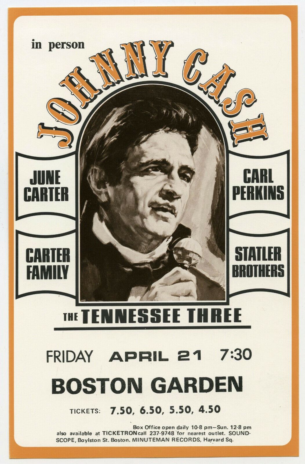 JOHNNY CASH with the Tennessee Three, June Carter, CARL PERKINS, The Statler Brothers appearing on April 21, 1972 at Boston Garden in Boston, Massachusetts.