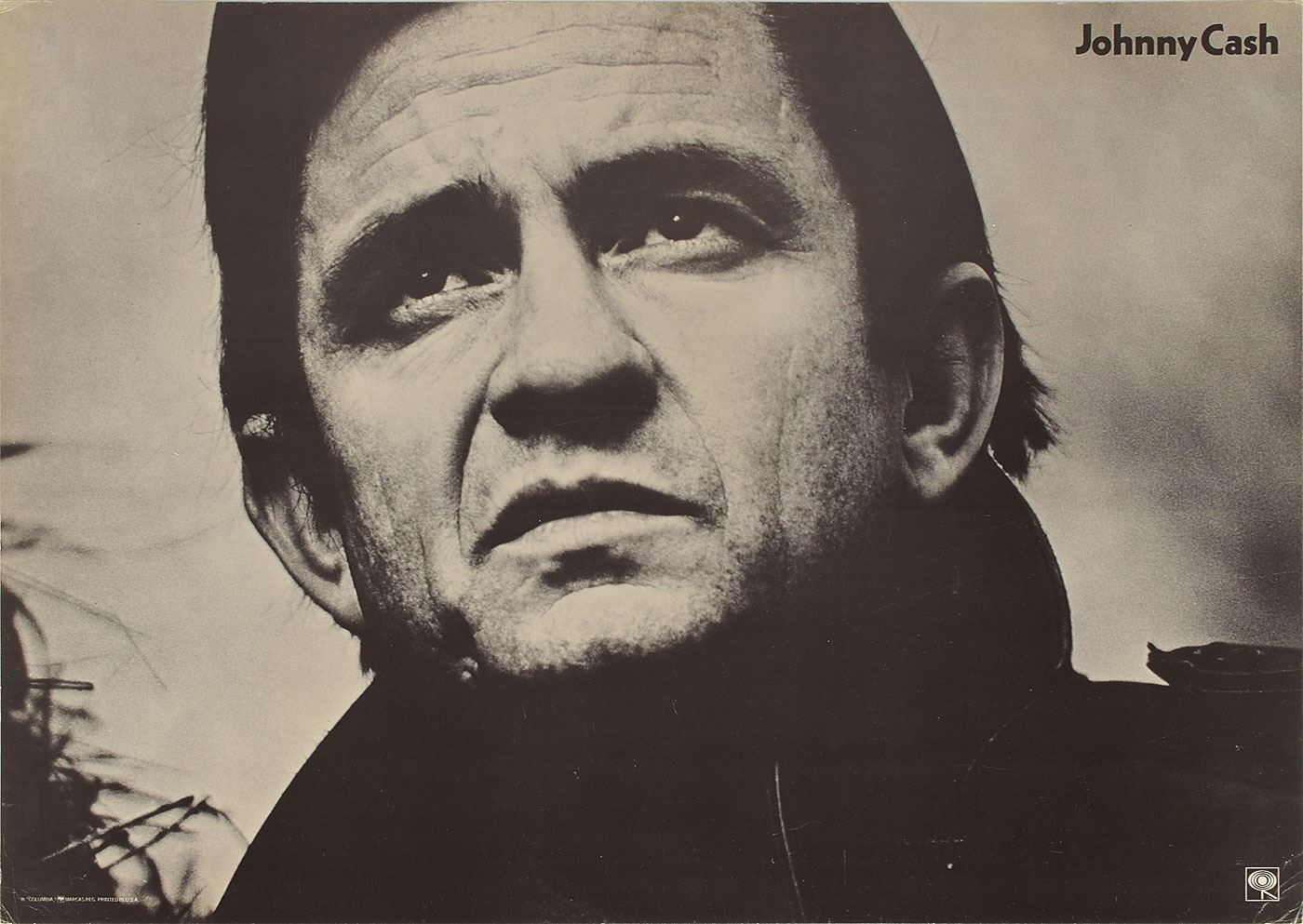 Original 28 x 20 CBS Records heavyweight cardstock promotional poster of Johnny Cash, featuring his name in black text in the upper right. In fine condition, with creasing to corners.