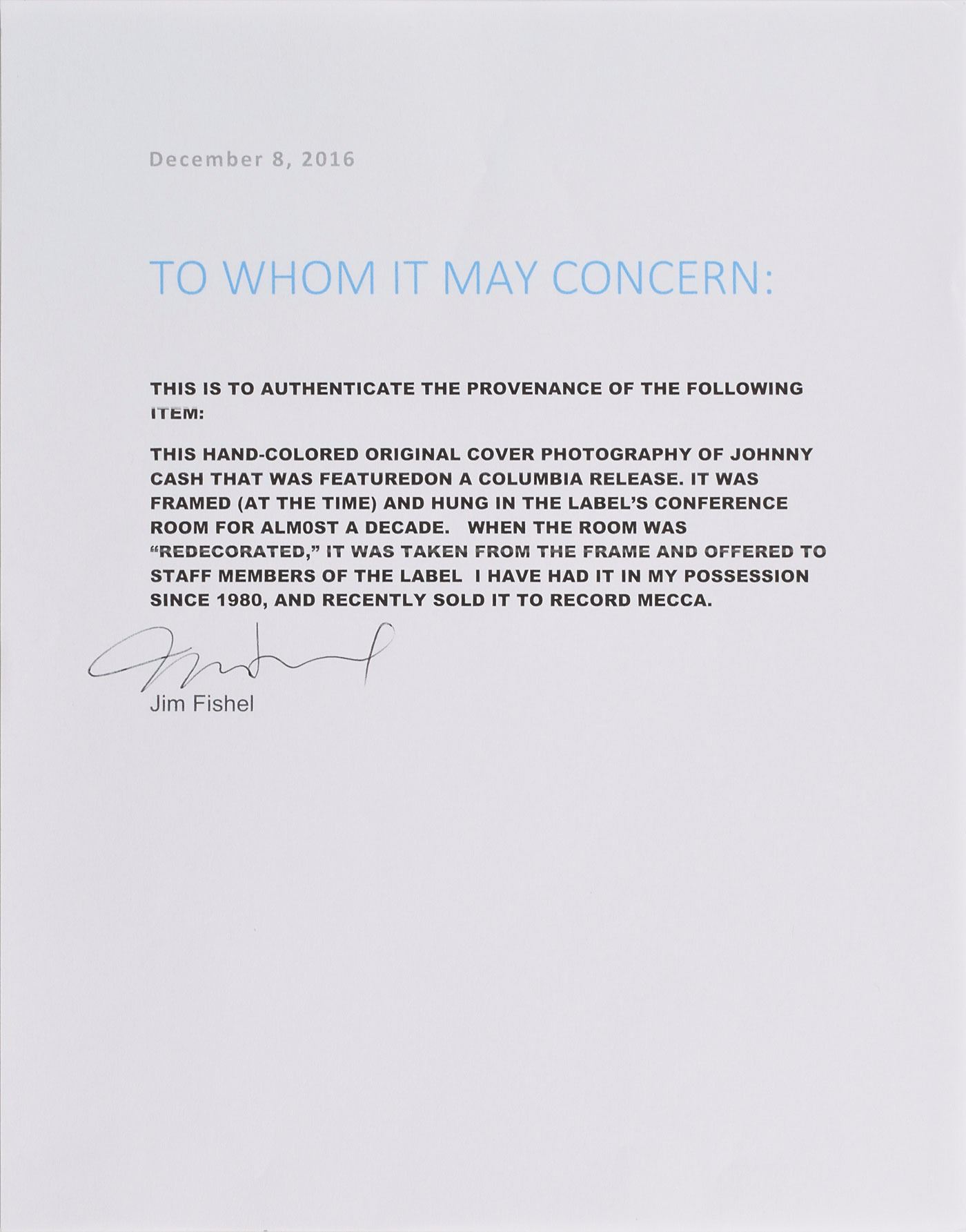 Vintage circa 1970s color satin-finish 14.5 x 20 photo of Johnny Cash that once hung in the Columbia Records conference room. Reverse bears "This paper manufactured by Kodak" watermarks. In fine condition, with scattered creasing and toning. Accompanied by a letter of provenance from a former Columbia Records VP, stating, "It was framed (at the time) and hung in the Columbia Records conference room for almost a decade. When the room was 'redecorated,' it was taken from the frame and offered to staff members of the label. I have had it in my possession since 1980."