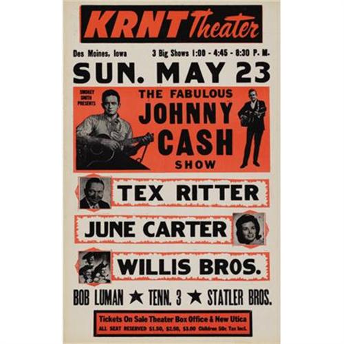<B>Johnny Cash Show KRNT Theater Concert Poster (c. 1966).</B></I> The Man in Black stars in this early roadshow-style poster, which also features June Carter, Tex Ritter, and the Statler Brothers, performing in Des Moines, Iowa. The poster is printed in black and neon red on white cardstock measuring approximately 14" x 21", and is in Fine condition.<BR><BR><b>Shipping:</b> Flat Material, Large (<a target="_blank" href="http://www.heritageauctions.com/common/shipping.php">view shipping information</a>)