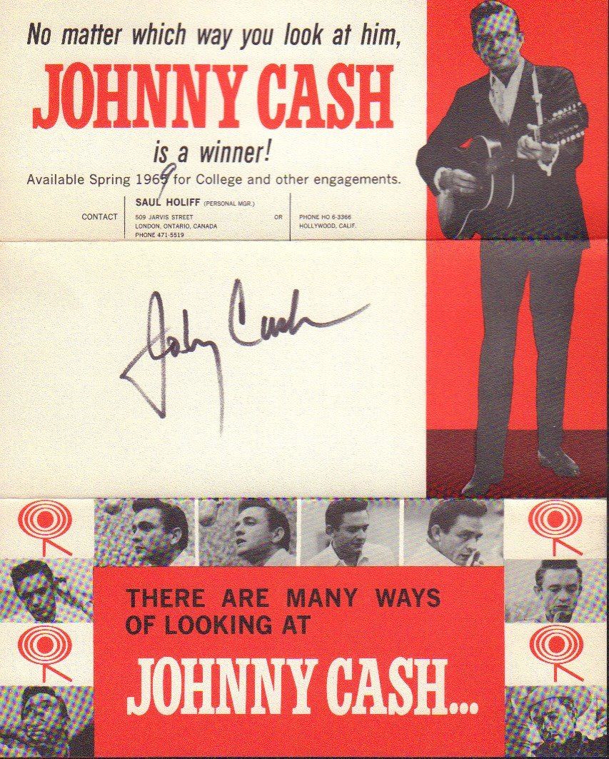 Original 1965 concert booking brochure signed by The Man in Black, Johnny Cash. The brochure was originally printed for use in 1965 but Johnny has crossed out the 5 and written in a 9 over the top of it. It is in as near mint condition as you can get. All items come with a certificate of authenticity good for the life of the piece.