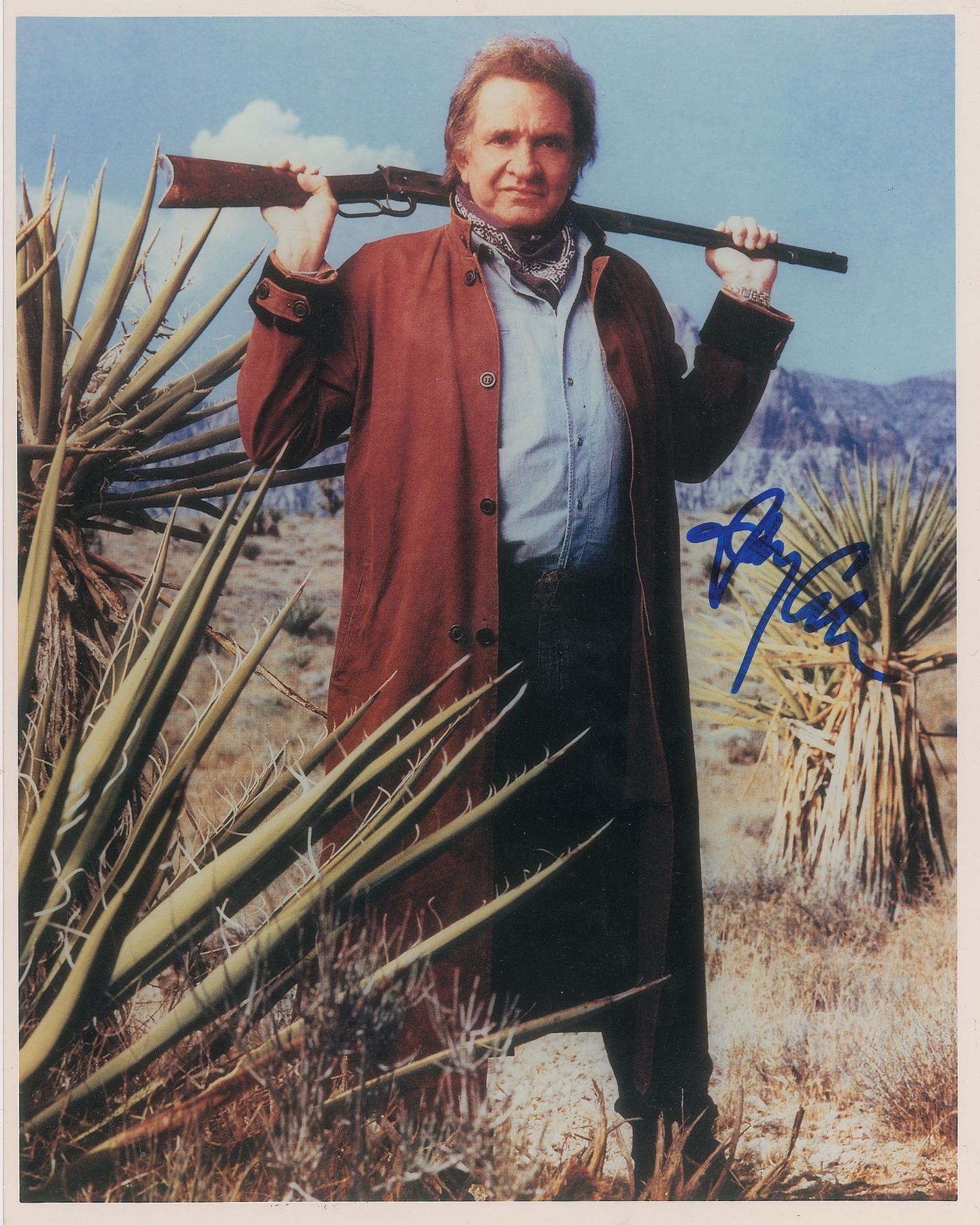 Color glossy 8 x 10 photo of Johnny Cash holding a rifle over his shoulders and surrounded by desert yucca plants, signed in blue felt tip. In very fine condition.