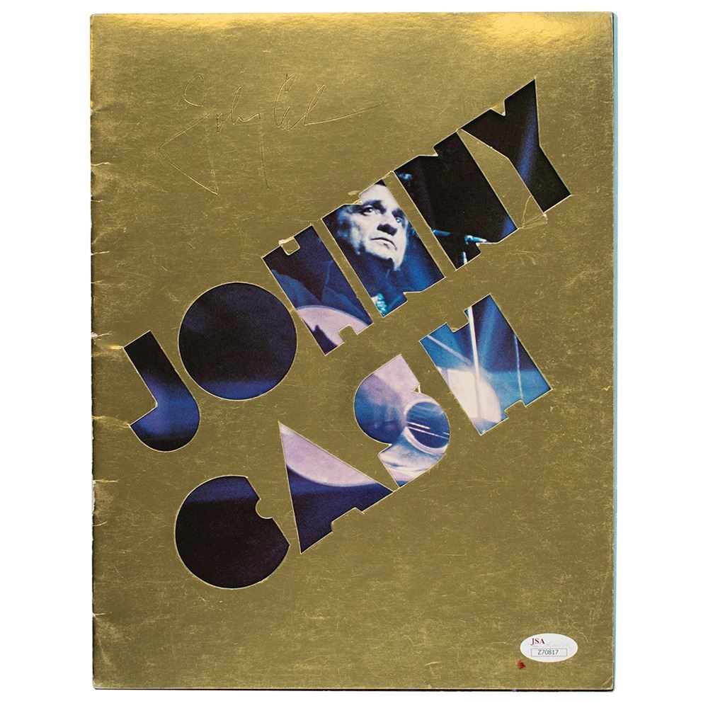 Circa 1975 Johnny Cash souvenir tour book, 9.25 x 11.75, signed on the front cover in black ballpoint. The interior pages are also signed by other members of the tour, including: June Carter Cash, Rosey Lawhead, Chance Martin, and Tommy Cash. In very good to fine condition, with general handling wear, a JSA label affixed to the front cover, and all of the inner pages detached. Accompanied by a full letter of authenticity from JSA.