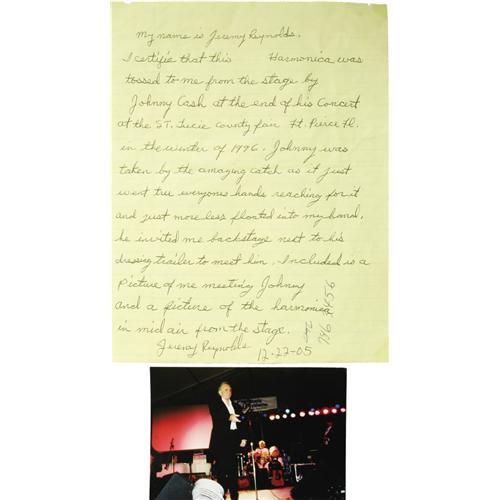 <B>Johnny Cash Used Harmonica.</B></I> This Hohner brand Marine Band harmonica exemplifies Johnny Cash's personal generosity and legendary showmanship. It was used by Cash and tossed from the stage into the hands of a lucky fan at the conclusion of Cash's concert at the St. Lucie County Fair in Ft. Pierce, Florida, in the Winter of 1996. (Said fan was invited backstage, and color snaps of both the throw and the meeting are included with the harmonica.) The item is in Excellent condition with just a little bit of wear and tarnishing. <I>Accompanied by handwritten letter of authenticity from the owner.</B></I><I>From the Robert Johnson Memorabilia Collection.</B></I><BR><BR><b>Shipping:</b> Musical Instruments, Small (<a target="_blank" href="http://www.heritageauctions.com/common/shipping.php">view shipping information</a>)