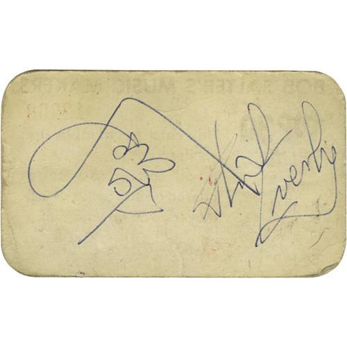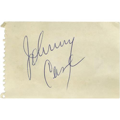 <B>Johnny Cash and the Everly Brothers Autographs.</B></I> Includes a small notepad leaf signed by Cash in blue ink and a music club card signed on the back by Phil and Don Everly in blue ink, obtained in Seattle in 1957 by then-student Marie Steinaker (nee Perez). Of the Cash signature, Perez recalls: "We got Johnny Cash's signature while we were at the Bon Marche department store in Seattle. We were the only customers in there at the time. There was a local TV personality talking to Johnny Cash. We asked Johnny for his autograph and after he signed, the TV personality came and asked us not to bother him anymore (which we weren't going to anyway). They were both nice enough but Johnny was very tired looking and he looked pretty ragged." The Cash signature is in Excellent condition with some light tanning and a little discoloration on the back. The Everly Brothers signature is in Very Fine condition with a little wear, tanning and soiling. <I>Accompanied by LOA from PSA/DNA.</B></I>