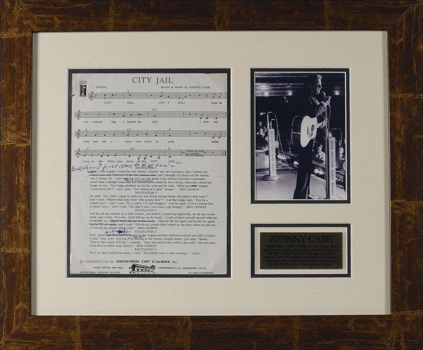 Printed sheet music and lyrics to ‘City Jail,’ one page, 8.5 x 11, produced by the House of Cash, featuring several handwritten lyrical corrections in Cash’s hand. Cash crosses out one line and writes, “Back to when I first come to this town.” He also crosses out portions of several lines, and adds two other lyric fragments. Cloth matted and framed with a photo of Cash on stage and a descriptive plaque to an overall size of 23.5 x 19.5. In fine condition.