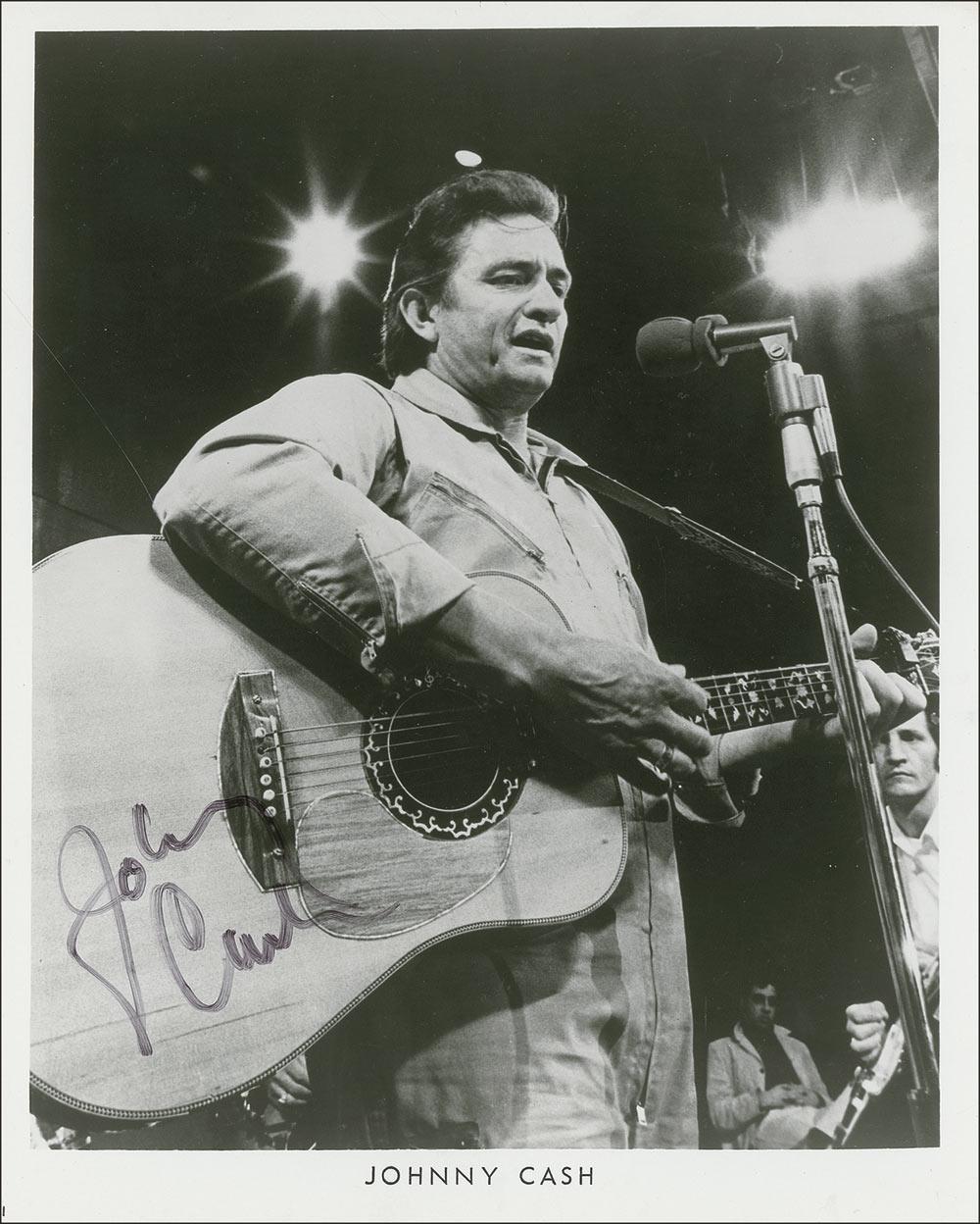 Glossy 8 x 10 photo of Cash on stage with his guitar, signed in black felt tip. In fine condition, with a few scattered light surface marks.