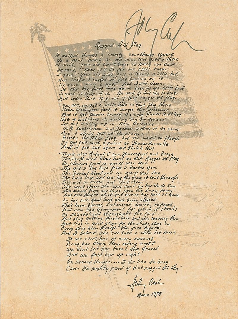 Souvenir printed lyrics to ‘Ragged Old Flag,’ on an off-white 8.5 x 11.5 sheet, signed at the top in black felt tip by Cash. In fine condition, with some light wrinkling.
